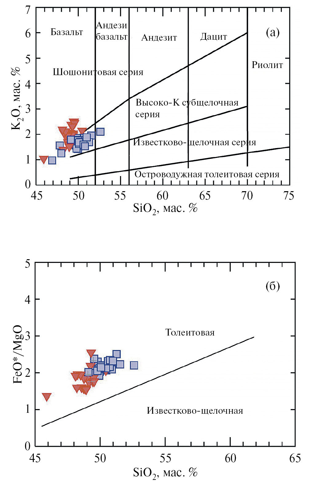 Рис. 4. Классификационные диаграммы (а) K2O–SiO2 (Le Maitre et al., 1989, 2002; Peccerilo, Tailor, 1976) и (б) FeO*/MgO–SiO2 (Miyashiro, 1974).