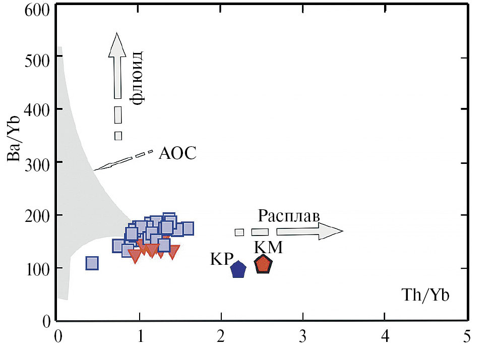 Бедные SiO2 калиевые щелочные магмы в небольших объемах (<1%) встречаются в различных геодинамических обстановках, в том числе субдукционных. Их происхождение часто рассматривается как многостадийный процесс плавления надсубдукционных ультрабазитов, которые обогащены амфиболом и/или флогопитом в результате фильтрации флюида и/или расплава из подстилающей океанической плиты (Sorbadere et al., 2013; Straub et al., 2013). Участие наряду с ультрабазитовым минеральным парагенезисом пироксенитовой ассоциации минералов в генерации основных расплавов для OIB предполагалось, например, в работах (Morgan, 2001; Sobolev et al., 2007; Herzberg, 2011), для MORB – в (Allègre, Turcottet, 1986; Ingle et al., 2010), для надсубдукционных лав – в (Straub et al., 2013). Пироксенитовый компонент был реконструирован на основании изотопно-геохимических исследований валового состава пород (Nikulin et al., 2012; Давыдова и др., 2019) и расплавных включений в оливинах из вулканитов (Некрылов и др., 2018) Центрально-Камчаткой депрессии и Срединного хребта.