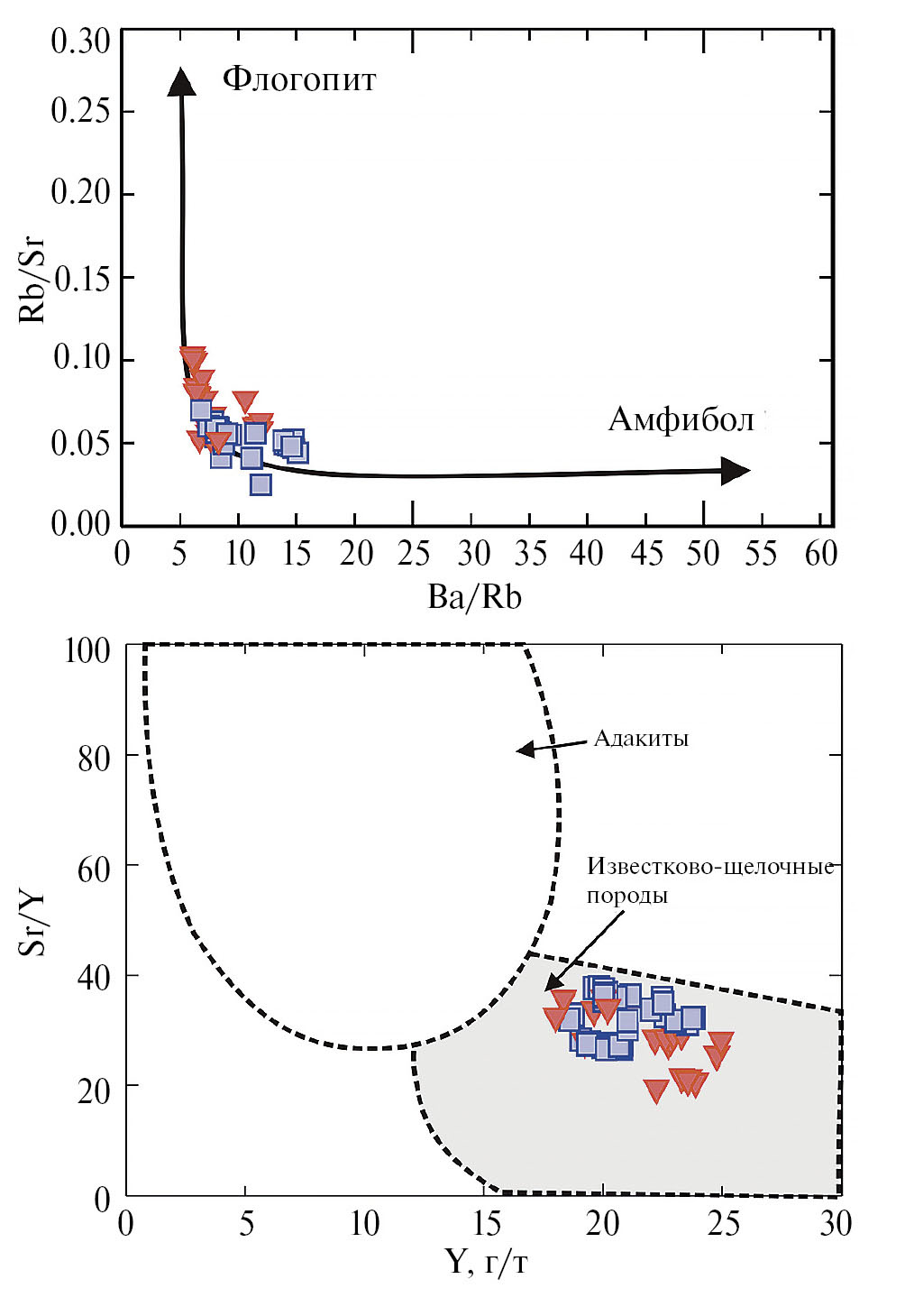 Высокие значения K2O/Rb и Rb/Sr указывают на присутствие биотита и амфибола в источнике, а низкие величины Sr/Y и плоские спектры распределения средних и тяжелых лантаноидов – на отсутствие граната в реститовой ассоциации (рис. 9).