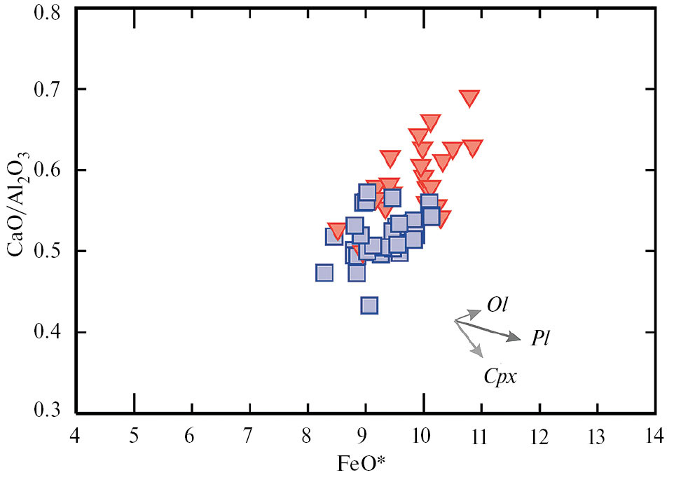 Кроме того, плавление перидотита при высоком давлении должно приводить к появлению магматической жидкости с низкими значениями CaO/Al2O3, тогда как в Ne-нормативных лавах оно достигает 0.7, превышая таковое в субщелочных базальтах.