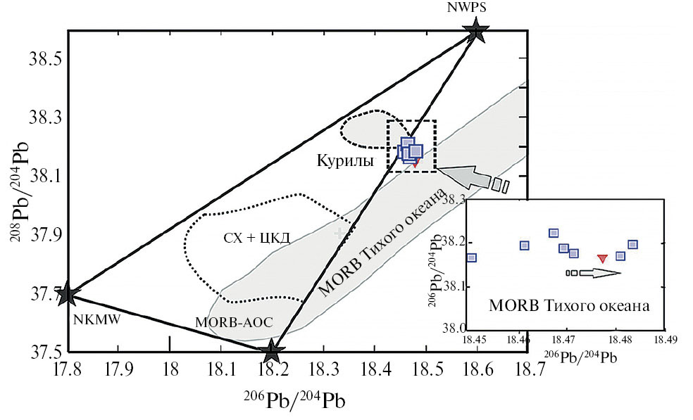 При решении вопросов магмогенезиса и геодинамики Северо-Западной Пацифики информативными являются изотопы свинца (Мартынов и др., 2012). На классификационных диаграммах составы исследованных образцов располагаются в узкой области поля MORB Индийского океана (206Pb/204Pb = 18.30–18.53, 207Pb/204Pb = 15.31–15.51, 208Pb/204Pb = 38.17–37.93), смещенной, по сравнению с фронтальными лавами Курил, к полю MORB Тихого океана (рис. 11б). Близкий к линейному характер тренда указывает на участие в магмогенезисе двух изотопных резервуаров – индийского и тихоокеанского MORB-типа (Klein et al., 1988; Rehkamper, Hofmann, 1997; Pearce et al., 1999; Nebel et al., 2007). Учитывая конфигурацию этих резервуаров в Северо-Западной Пацифике (Мартынов и др., 2012), можно предположить участие в магматическом процессе как надсубдукционной мантии, так и океанической литосферы и/или астеносферы.