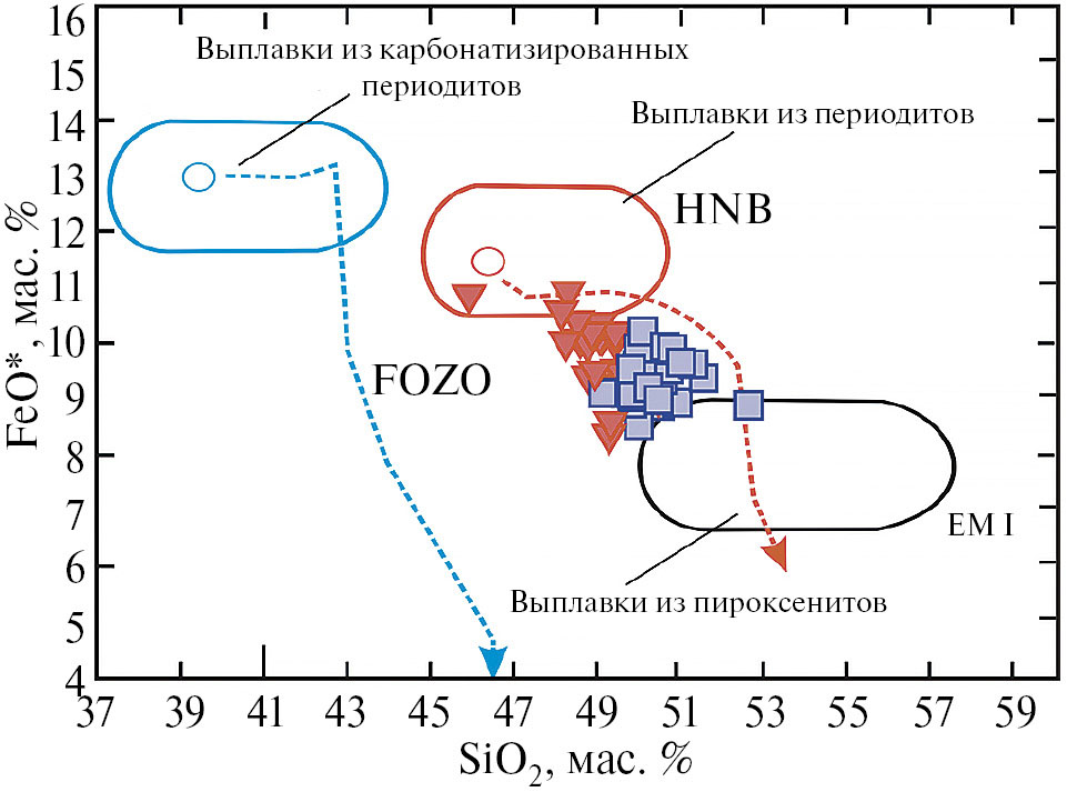Мантийные компоненты: FOZO – мантия фокусной зоны; DMM – деплетированный мантийный источник MORB; HNB – высоко-Nb базальты; EM I – обогащенная мантия I-типа. Штриховыми линиями показаны пути фракционной кристаллизации. Поля выплавок: из карбонатизированных перидотитов по (Sakuyama et al., 2013), из передотитов по (Kogiso et al., 1998), из пироксинитов по (Pertermann, Hirschmann, 2003). Условные обозначения см. рис. 3.