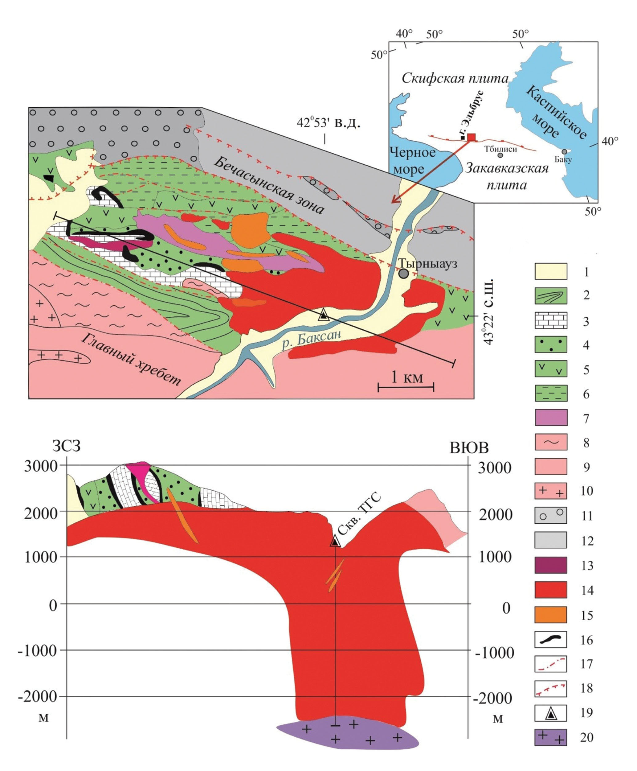 1 – четвертичные отложения; 2–7 – зона Передового хребта: 2 – глинистые сланцы, алевролиты, песчаники (джигиатская свита), J1-2, 3 – известняки (нижняя подсвита гидамской свиты), D3–С1, 4 – алевролиты, песчаники, конгломераты (верхняя подсвита гидамской свиты), D3–С1, 5 – лавы основного, среднего и кислого составов, туфы, туффиты, песчаники, конгломераты, глинистые сланцы, линзы известняков, кремни (кизилкольская и эльмезтюбинская свиты), D2–D3, 6 – филлиты, алевролиты, песчаники (артыкчатская и картджюртская свиты), D1-2, 7 – плагиограниты (трондъемиты), PZ2; 8–10 – зона Главного хребта: 8 – кристаллические сланцы, гнейсы, амфиболиты (макерская серия, дуппухская и ктитебердинская свиты), PR2, 9 – мигматиты, мигматизированные гнейсы, сланцы, амфиболиты (гондарайский комплекс), PR2, 10 – граниты (белореченский и уллукамский комплексы), PZ2-3; 11, 12 – Бечасынская зона: 11 – песчаники, конгломераты, алевролиты, аргиллиты, С3, 12 – хлорит-мусковит-альбитовые, мусковит-альбитовые сланцы (шаукольская свита), PR2; 13–15 – Тырныаузский магматический комплекс: 13 – лейкократовые граниты, N22, 14 – эльджуртинские граниты, N22, 15 – риолиты, N22; 16 – скарново-рудные тела с Mo-W оруденением; 17 – сбросы; 18 – надвиги; 19 – местоположение Тырныаузской глубокой скважины (ТГС); 20 – двуслюдяные граниты.