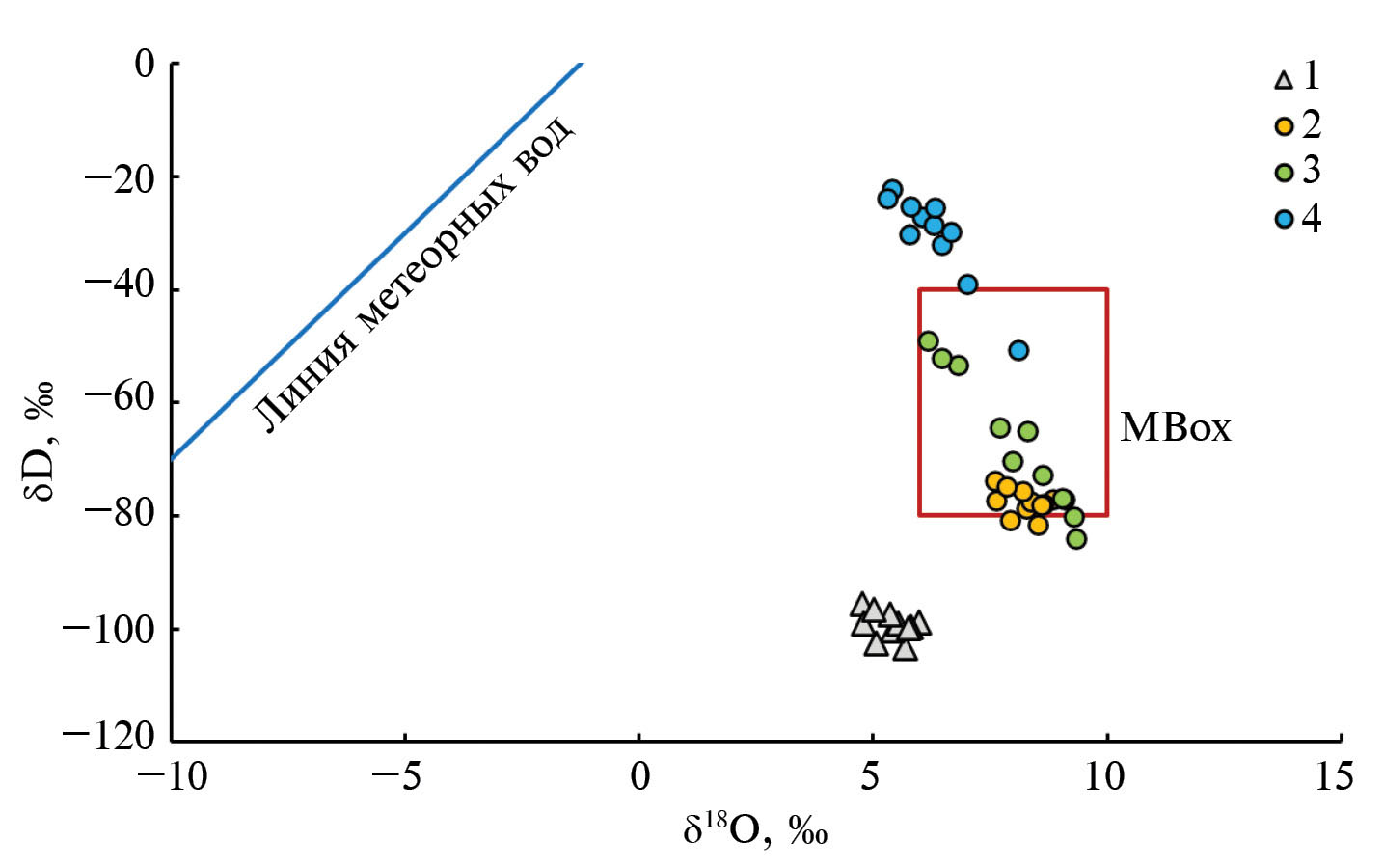 Рис. 14. Изотопные характеристики (δ18О и δD) биотита гранитов Эльджуртинского массива (1) и рассчитанные параметры водного компонента флюида (2–4), равновесного с биотитом при: 2 – температуре формирования биотита, согласно Ti–ХMg термометру; 3 – температуре закрытия изотопной системы кислорода кварца; 4 – температуре закрытия биотита (расчет по методу Farquhar et al., 1993) (см. пояснения в тексте). МВох – “магматический” бокс.