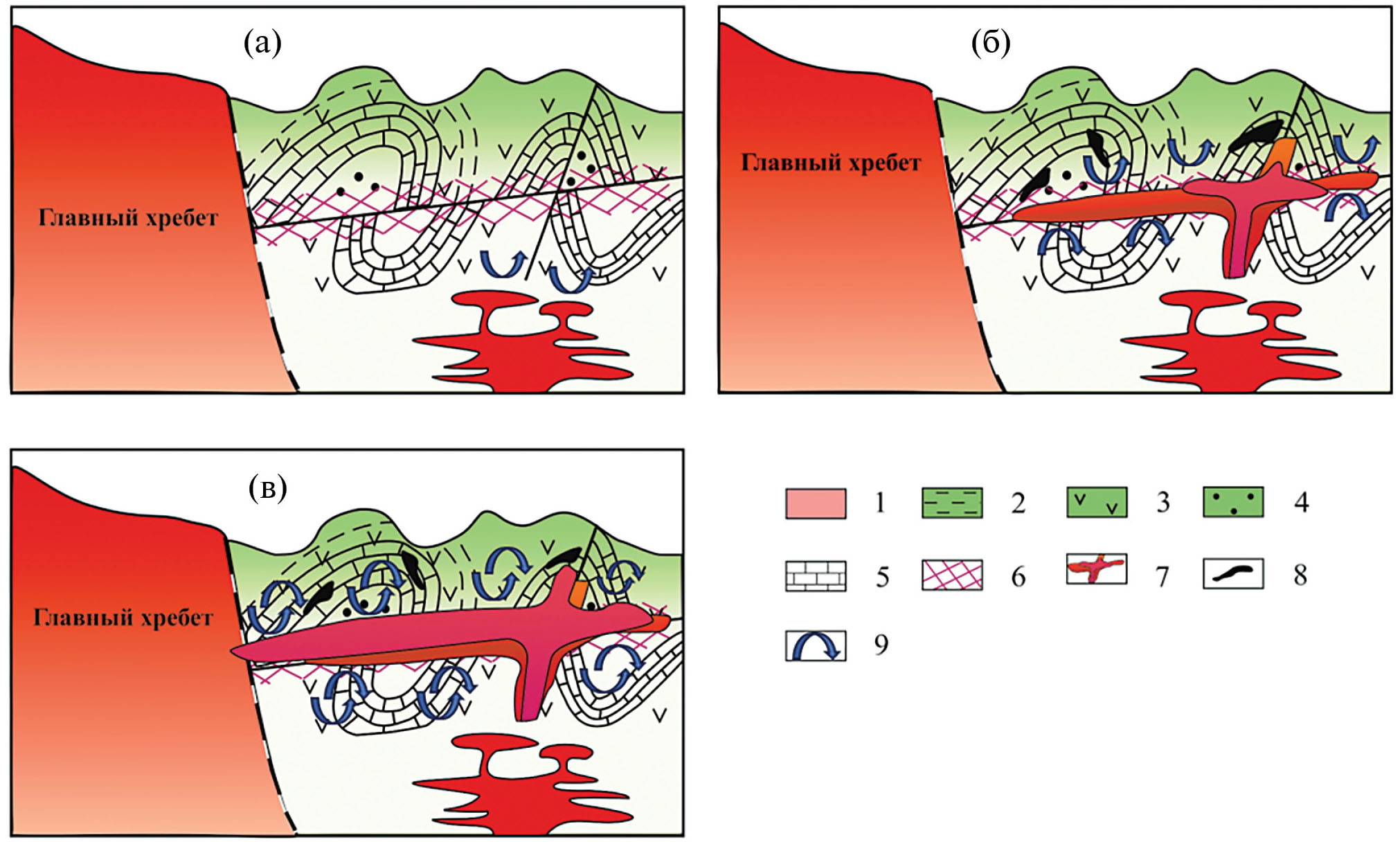 Рис. 15. Схема становления Эльджуртинского массива: (а) – этап перед внедрением расплавов биотитовых гранитов, возникновение разломов и ослабленных зон; (б) – внедрение первой порции расплавов и начало внедрения второй порции; (в) – окончание внедрения второй порции расплавов и остывание массива как единого тела. 1 – зона Главного хребта (мигматиты, гнейсы, сланцы); 2–5 – зона Передового хребта: 2 – филлиты, алевролиты, песчаники, 3 – лавы основного, среднего и кислого составов, туфы, туффиты, песчаники, конгломераты, глинистые сланцы, 4 – алевролиты, песчаники, конгломераты, 5 – известняки; 6 – зона трещиноватости; 7 – гранитные расплавы; 8 – скарново-рудные тела с Mo-W оруденением; 9 – зоны циркуляции флюида.