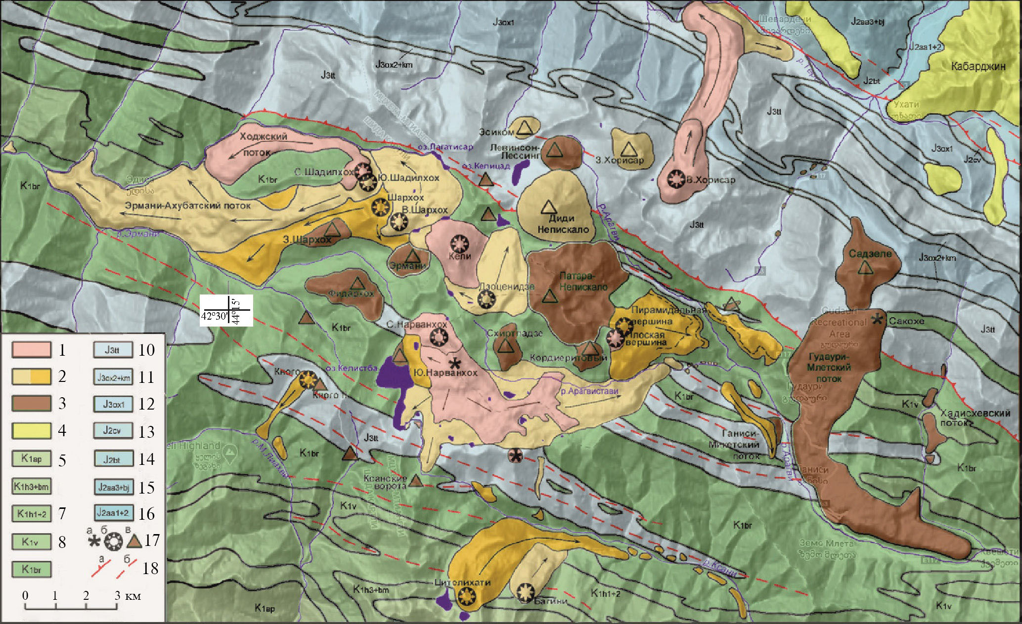 Рис. 1. Карта проявлений четвертичного вулканизма на Кельском нагорье (Большой Кавказ) по данным (Лебедев и др., 2011). Стратиграфическое расчленение пород фундамента по (Mosar et al., 2022). 1 – вулканиты III (поздненеоплейстоцен–голоценовой) фазы активности; 2 – вулканиты II (поздненеоплейстоценовой) фазы активности; 3 – вулканиты I (средненеоплейстоценовой) фазы активности; 4 – четвертичные лавы вулканов Казбек и Кабарджин; 5–16 – осадочные породы фундамента (5–9 – мел, 10–16 – юра): 5 – свита Дгнали, терригенные кремнистые турбидиты; 6 – свита Пасанаури, терригенные кремнистые турбидиты; 7 – свита Бахани, аргиллиты, кремнистые и известковистые турбидиты; 8 – свита Эдиси, аргиллиты, кремнистые и известковистые турбидиты; 9 – свита Млети, аргиллиты, кремнистые и известковистые турбидиты; 10 – свита Ципори, известняки, известковистые турбидиты; 11 – свита Думатсхо, известняки, глинистые известняки, известковые глины, 12 – свита Казари, обломочные известковистые турбидиты; 13 – нарванская свита, обломочные известковистые турбидиты, редко кремнистые турбидиты; 14 – шеварденская свита, глинистые сланцы, редко терригенные кремнистые турбидиты, местами песчанистые известняки; 15 – бусарчильская свита, глинистые сланцы, кремнистые терригенные турбидиты, песчаники; 16 – гудушаурская свита, глинистые сланцы, алевролиты, терригенные кремнистые турбидиты; 17 – вулканические аппараты: а – стратовулканы и экструзивные купола; б – шлаковые конусы; в – лавовые вулканы; 18 – тектонические структуры: а – надвиги, б – оси крупных складок.