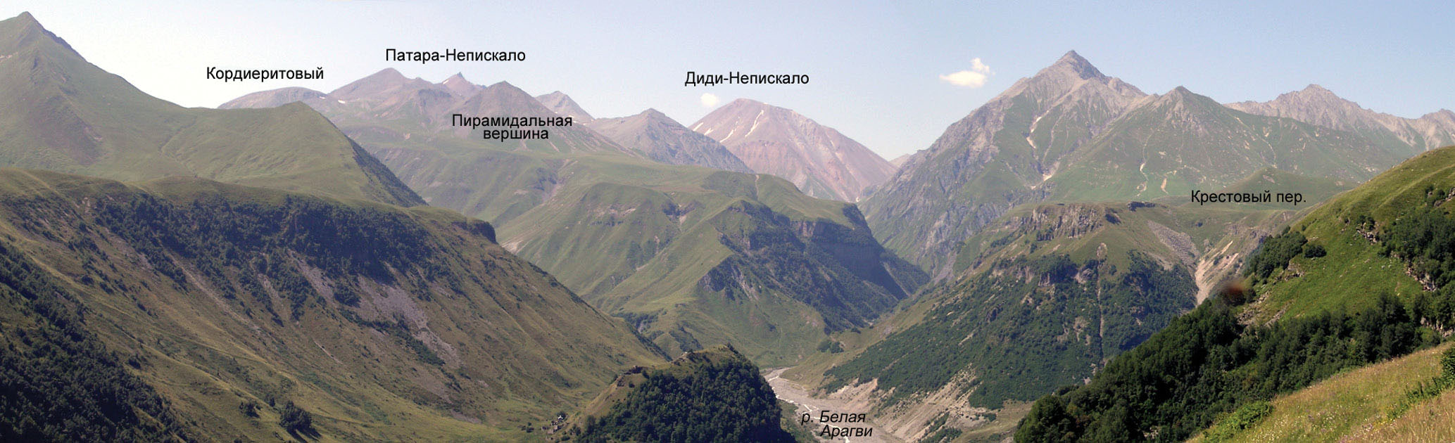 Рис. 2. Вид на вулкан Кордиеритовый и вулканический массив Патара-Непискало из района с. Гудаури (фото В.А. Лебедева).