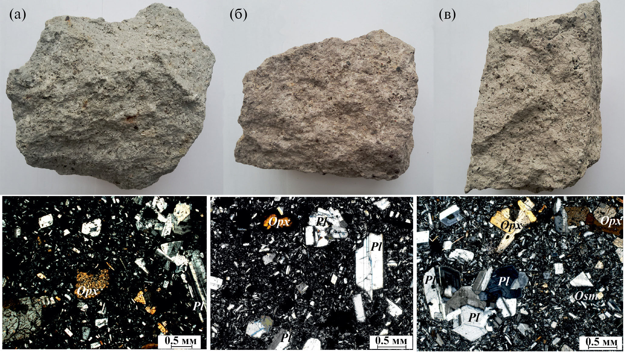 Рис. 3. Основные петрографические разности пород вулкана Кордиеритовый. (а) серые гранатсодержащие ортопироксеновые андезиты–дациты, (б) розовые осумилитсодержащие ортопироксеновые дациты, (в) серо-розовые осумилит-гранатсодержащие ортопироксеновые дациты.