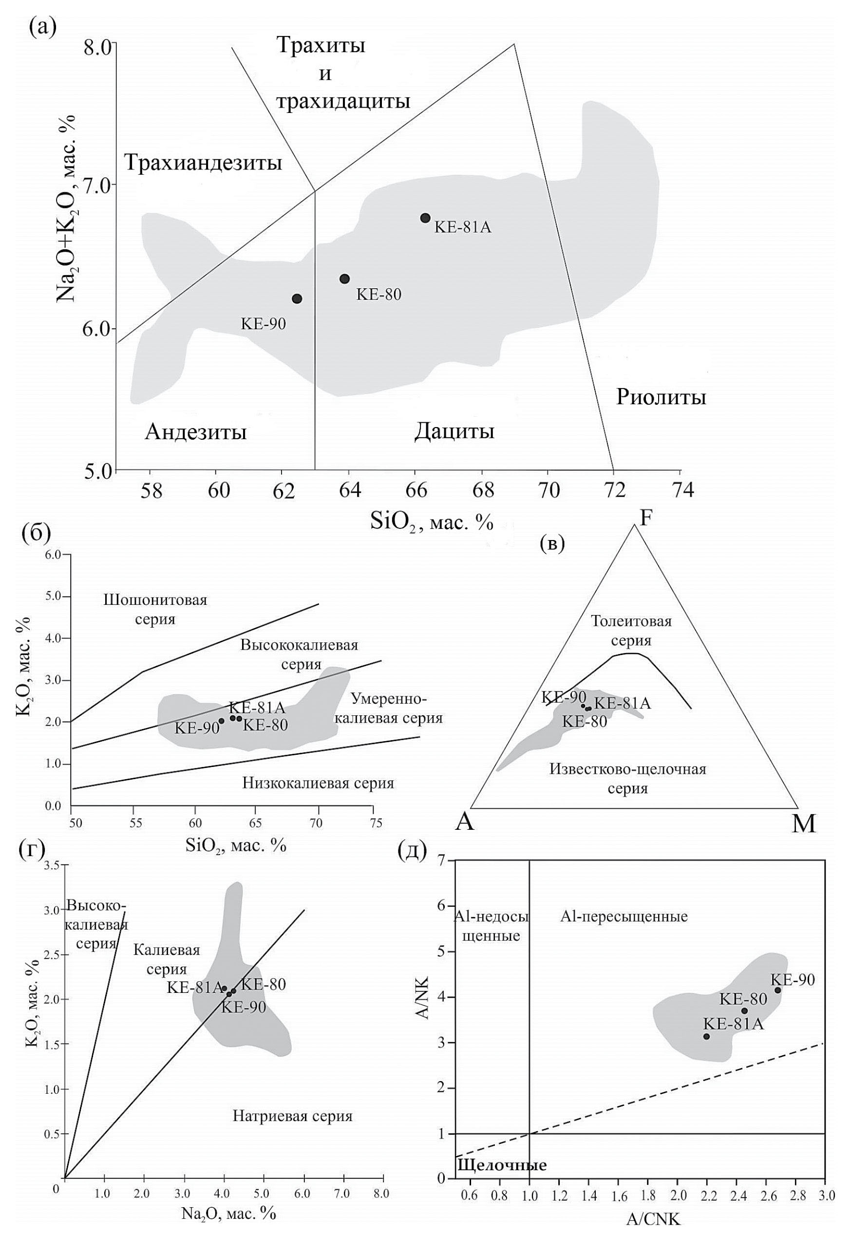 (а) TAS (Le Bas et al., 1986), (б) SiO2–K2O (Peccerillo, Taylor, 1976), (в) AFM (Irvine, Baragar, 1971), (г) Na2O–K2O (Middlemost, 1975), (д) A/CNK–A/NK (Shand, 1943).