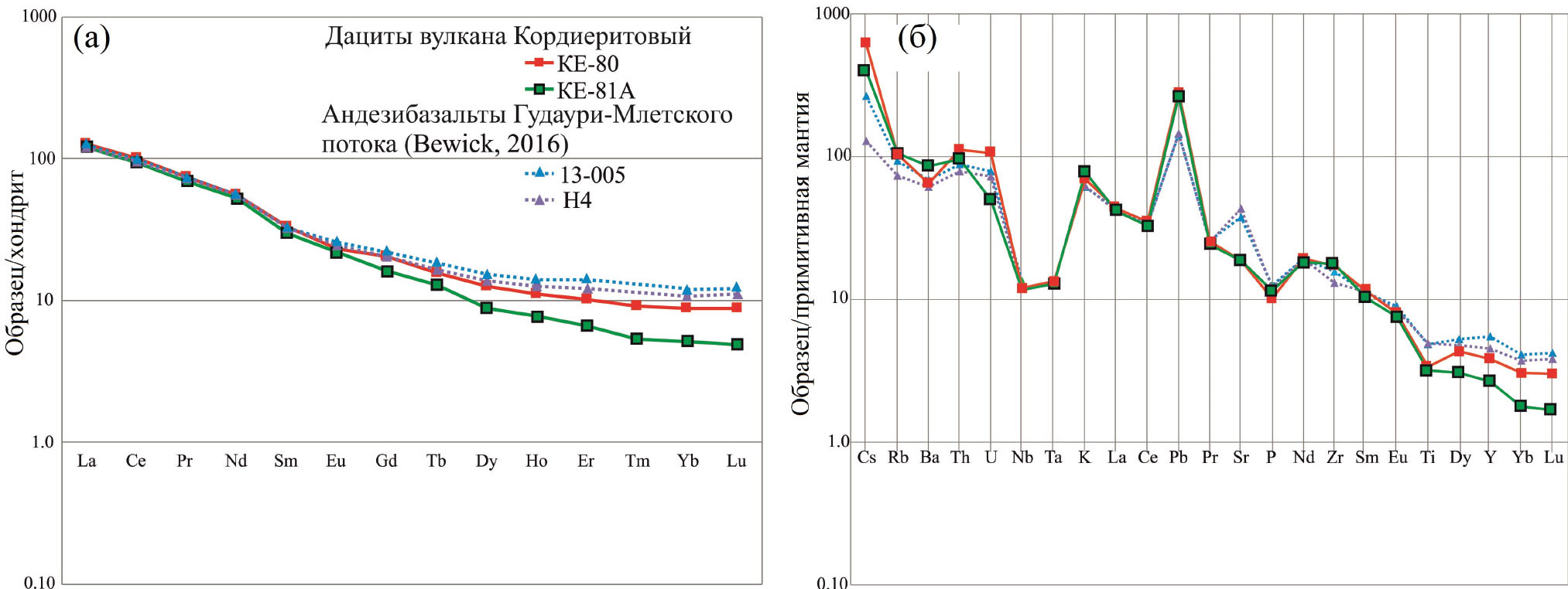 Спектры распределения РЗЭ для пород вулкана Кордиеритовый, нормированные по хондритовому резервуару, характеризуются пологим наклоном; Eu-аномалия отсутствует (рис. 5а). В секторе легких РЗЭ (от La до Eu) спектры серых и розовых разностей лав вулкана Кордиеритовый идентичны между собой и спектрами андезибазальтов Гудаури-Млетского потока с обогащением по отношению к хондритовому резервуару от 100 (для La) до 20 (для Eu) раз. В секторе тяжелых РЗЭ наблюдается некоторое обеднение этими элементами серых дацитов, по сравнению с андезибазальтами Гудаури-Млетского потока, которое становится весьма существенным в розовых разностях с их обогащением по отношению к хондритовому резервуару менее чем в 10 раз.