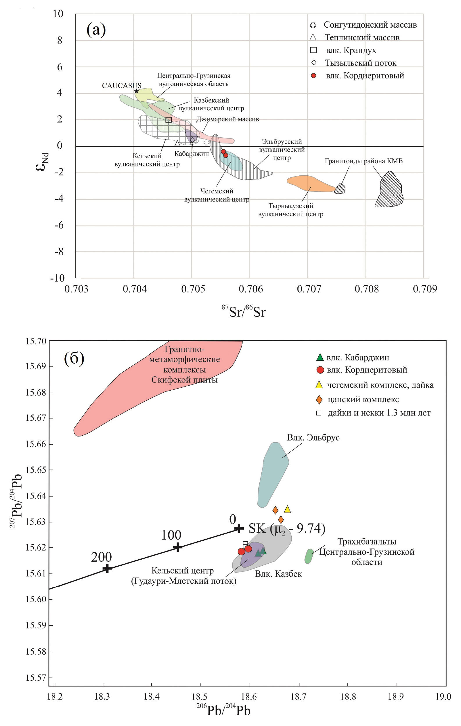 Нами изучена Sr-Nd-Pb изотопная систематика для валовых проб серых и серо-розовых разностей дацитов вулкана Кордиеритовый (обр. КЕ-80 и КЕ-81А; табл. 1). Диапазон значений 87Sr/86Sr в этих породах невелик и составляет 0.70553–0.70596. Изотопное отношение 143Nd/144Nd в обеих пробах совпадает в пределах погрешности (0.512602–0.512616) при εNd от –0.70 до –0.43. Отметим, что на Sr–Nd изотопной диаграмме (рис. 6а) составы изученных лав вулкана Кордиеритовый попадают не в поле других вулканитов Кельского нагорья, а в поле молодых магматических образований Эльбрусского и Чегемского вулканических центров Большого Кавказа, в петрогенезисе которых заметную роль играли коровые резервуары (Лебедев и др., 2011; Лебедев, Вашакидзе, 2014).