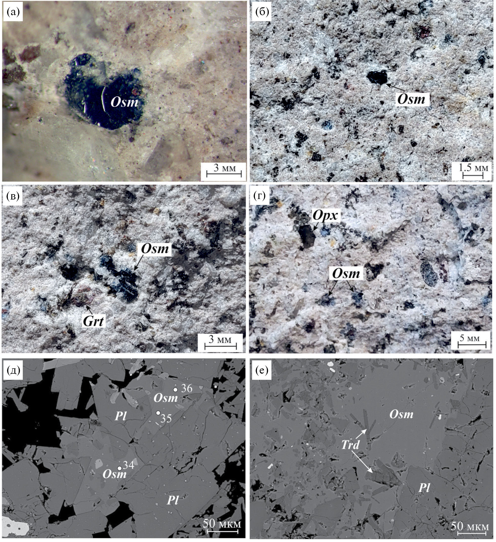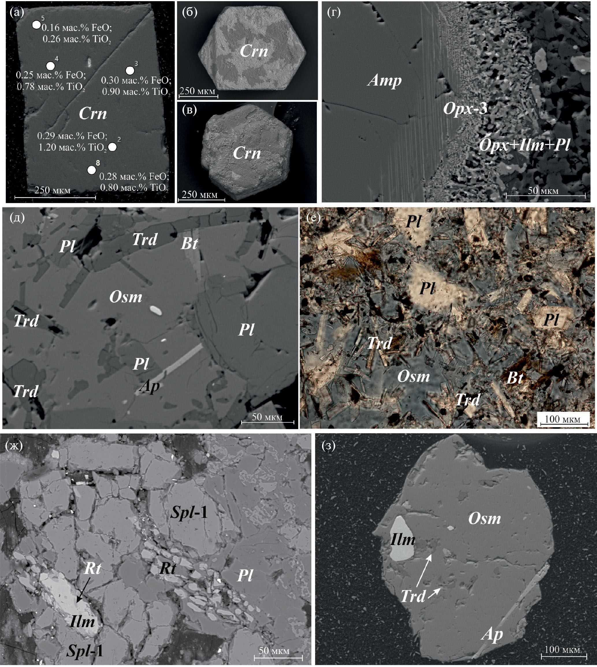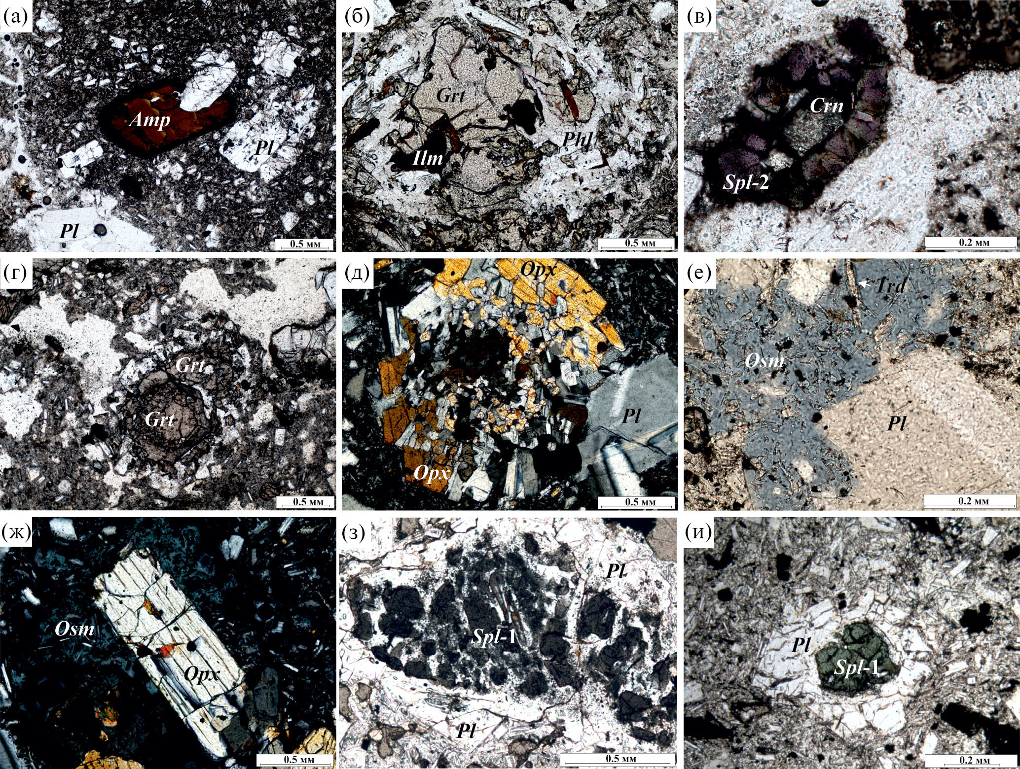 Здесь и далее аббревиатура минералов согласно (Warr, 2021): Amp – амфибол, Crn – корунд, Grt – гранат, Ilm – ильменит, Орx – ортопироксен, Osm – осумилит, Phl – флогопит, Pl – плагиоклаз, Spl – шпинель, Trd – тридимит. Фото (а–г, е, з, и) – при одном николе; фото (д, ж) – николи скрещены.