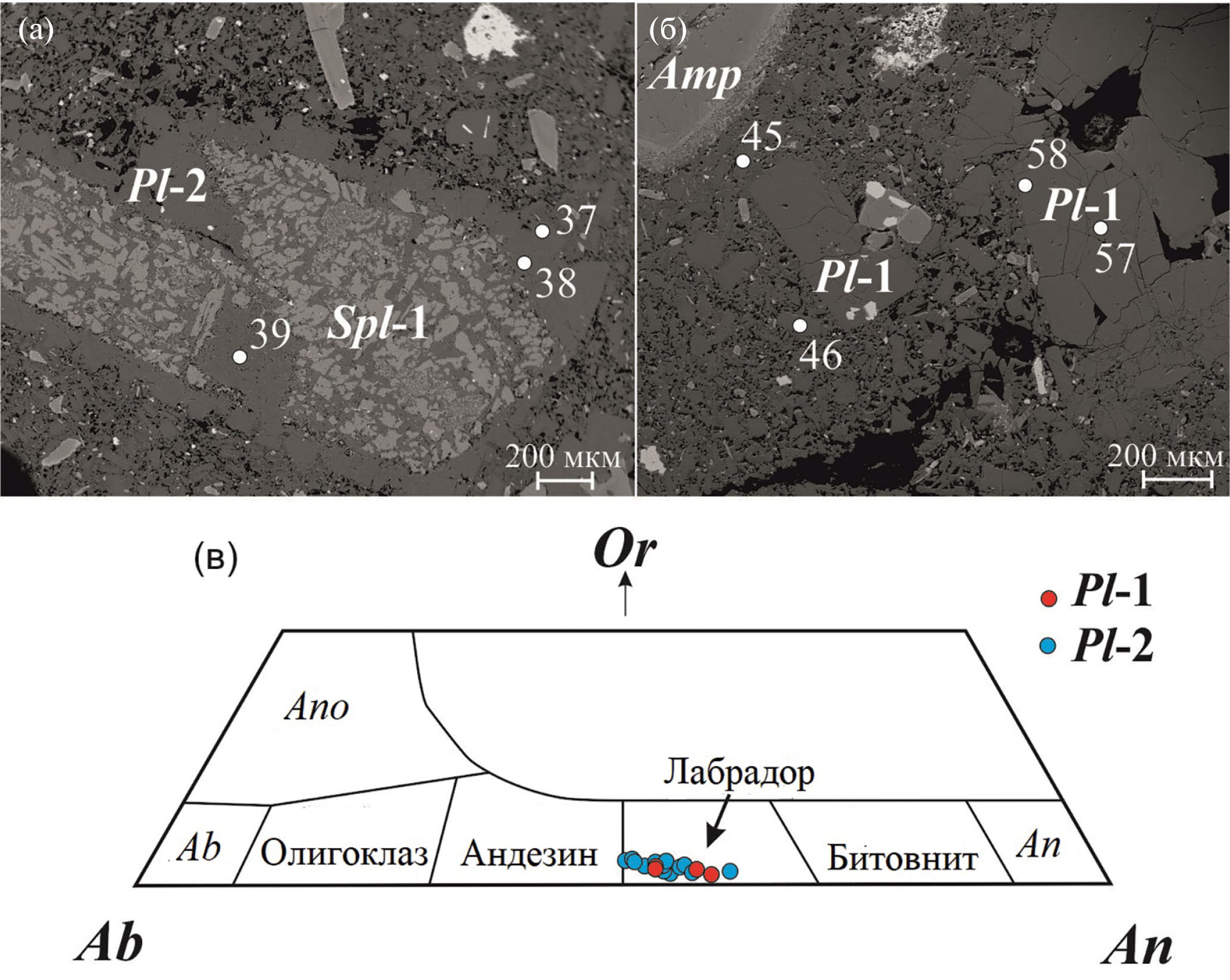(а) – плагиоклазовая кайма вокруг зерна ксеногенной шпинели, (б) – фенокристы Pl-1 с ростовой зональностью (изображения в обратнорассеянных электронах – BSE, номера точек на рисунке отвечают номерам в Supplementary 1, ESM_1), (в) – состав плагиоклазов из дацитов вулкана Кордиеритовый на тройной диаграмме Ab–An–Or.