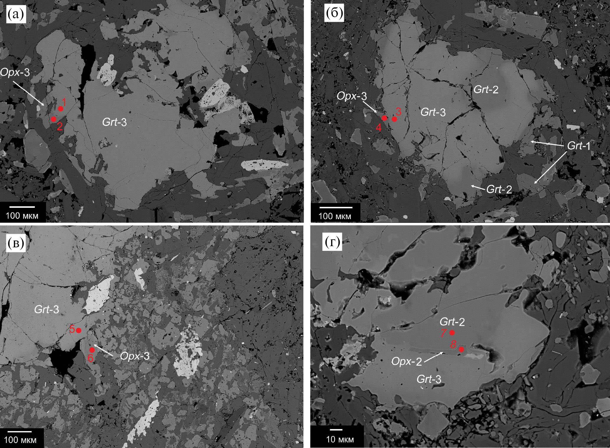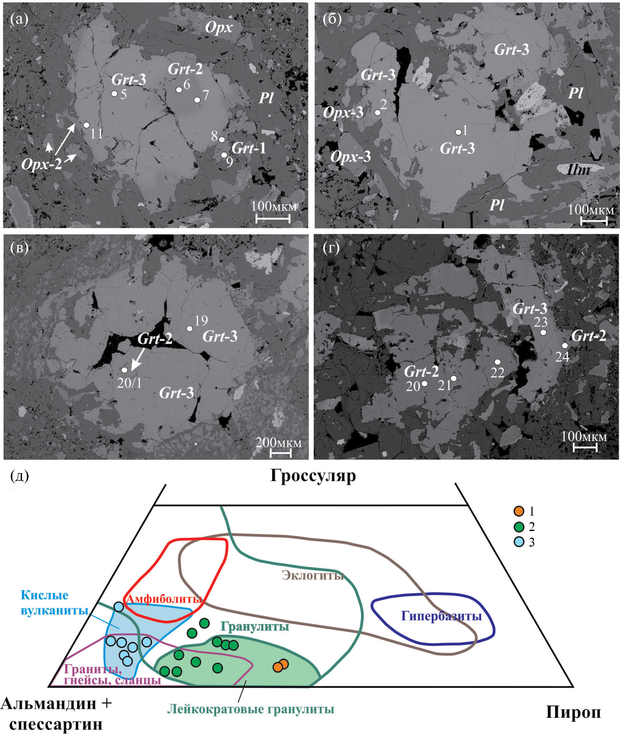 Гранат в качестве второстепенной фазы в небольших количествах (2–5 об. %) встречен в серых и серо-розовых разностях лав вулкана Кордиеритовый, исключительно в ассоциации минералов фенокристов (рис. 9). Все его выделения по составу относятся к альмандин–пироповому ряду (XAlm = 0.51–0.81), количество гроссулярового минала не превышает 18%, спессартинового – 11% (табл. 2, рис. 9д). На основании изучения состава фенокристов граната с помощью РСМА нами было выделено три его генерации (результаты анализов состава граната представлены в Supplementary 1, ESM_2).