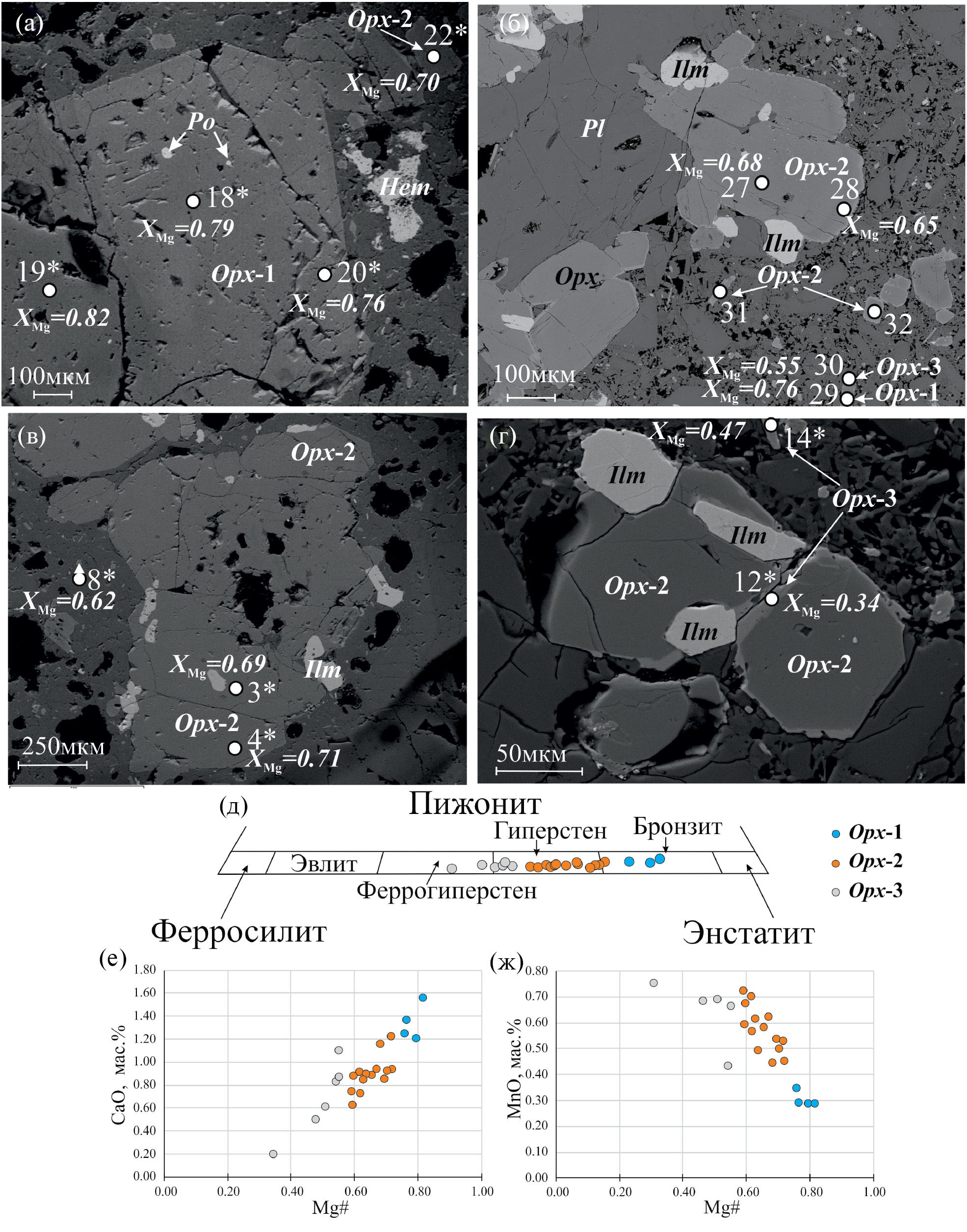Плагиоклаз – сквозной минерал во всех разностях пород вулкана Кордиеритовый (результаты анализов его состава представлены в Supplementary 1, ESM_1). Его выделения относятся к двум генерациям: Pl-1 – фенокристы; Pl-2 – микрофенокристы, зачастую образующие гломеропорфировые сростки (рис. 7д), и микролиты основной массы. Кроме того, наблюдаются плагиоклазовые реакционные каймы вокруг кристаллов шпинели и граната, сложенные микрокристаллами Pl-2 (рис. 8а). При этом выделения обеих генераций минерала представлены исключительно “кислым”лабрадором и характеризуются близким составом (фенокристы – An52—59, микрофенокристы – An54—56, микролиты – An49—55, каймы – An52—59). Количество ортоклазового компонента составляет 1–3%. Крупные фенокристы лабрадора при изучении на оптическом микроскопе обнаруживают ростовую зональность, однако изменения в их химическом составе от центра зерен к кайме (рис. 8б), согласно результатам РСМА, несущественны. Полученные данные свидетельствуют о том, что образование фенокристов плагиоклаза происходило на поздних стадиях магматического процесса, незадолго до излияния магматического расплава на дневную поверхность.
