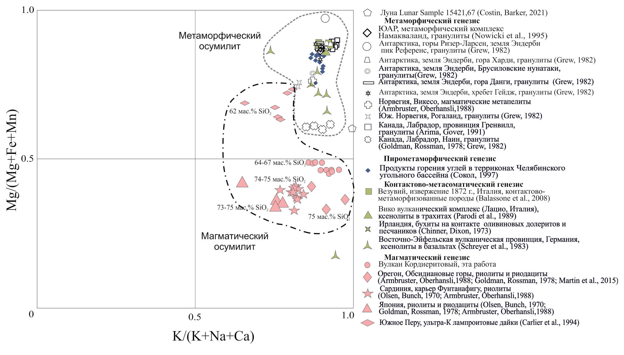 Еще одним важным итогом настоящей работы является проведенное обобщение опубликованных данных о химическом составе магнезиальных и железистых осумилитов, образовавшихся в широком спектре пород и имеющих различное происхождение (метаморфогенное, магматогенное, пирометаморфогенное). Нами наглядно показано (рис. 12), что, несмотря на существование единого изоморфного ряда составов между осумилитом-(Fe) и осумилитом-(Mg), выделения этих минералов магматогенного и метаморфогенного происхождения достаточно четко разделяются по соотношению Mg/(Mg + Fe + Mn) (метаморфогенные осумилиты практически во всех случаях представлены высокомагнезиальными разностями), что позволяет использовать для определения его генезиса диаграмму K/(K + Na + Ca)–Mg/(Mg + Fe + Mn), ранее предложенную в работе (Balassone et al., 2008) исключительно в качестве классификационной.