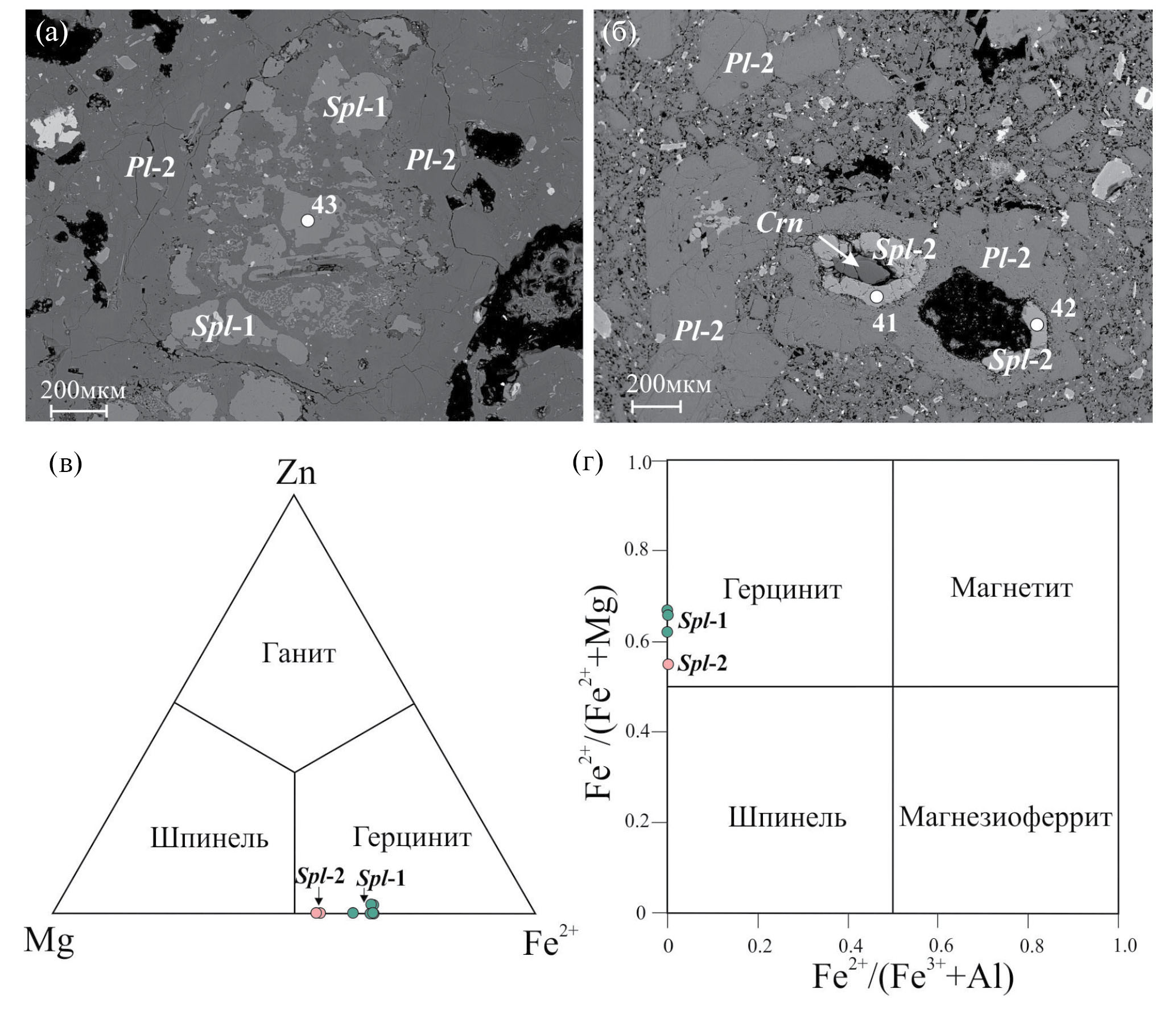 Акцессорные фазы представлены шпинелью (до 1 об. %) темно-зеленого и зеленовато-серого цвета, которая встречается в виде скоплений ксеноморфных зeрен, окруженных каймой из микрокристаллов короткопризматического плагиоклаза, а также единичными зернами циркона, апатита и выделениями рудных минералов (в основном ильменит, редко пирротин), размер которых 0.2–0.3 мм. В совокупности акцессорные минералы слагают до 3% от объема породы.