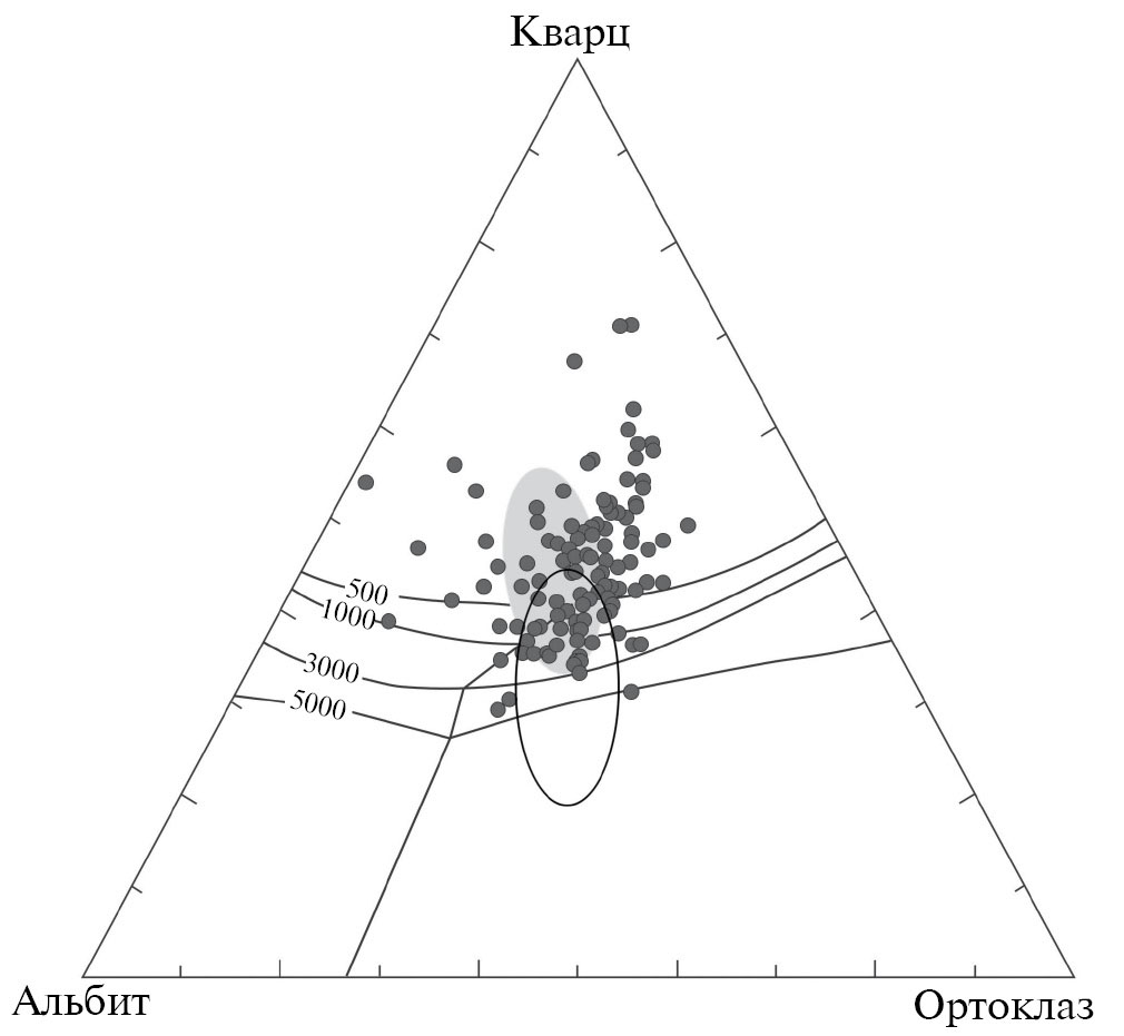 Рис. 9. Диаграмма кварц–альбит–ортоклаз с фигуративными точками модельного силикатного расплава гранитов Катугинского массива и тройными минимумами. Серое поле – составы биотитовых гранитов западного сателлита. Незалитый эллипс – поле составов гранитов Катугинского массива, рассчитанных по валовому составу (силикатный и фторидно-натровый расплавы) гранитов, по данным (Донская и др., 2018).