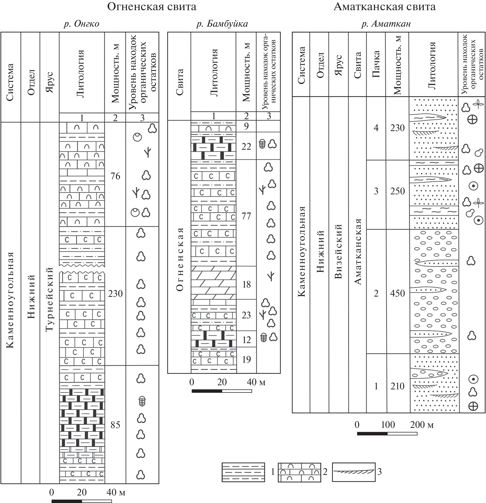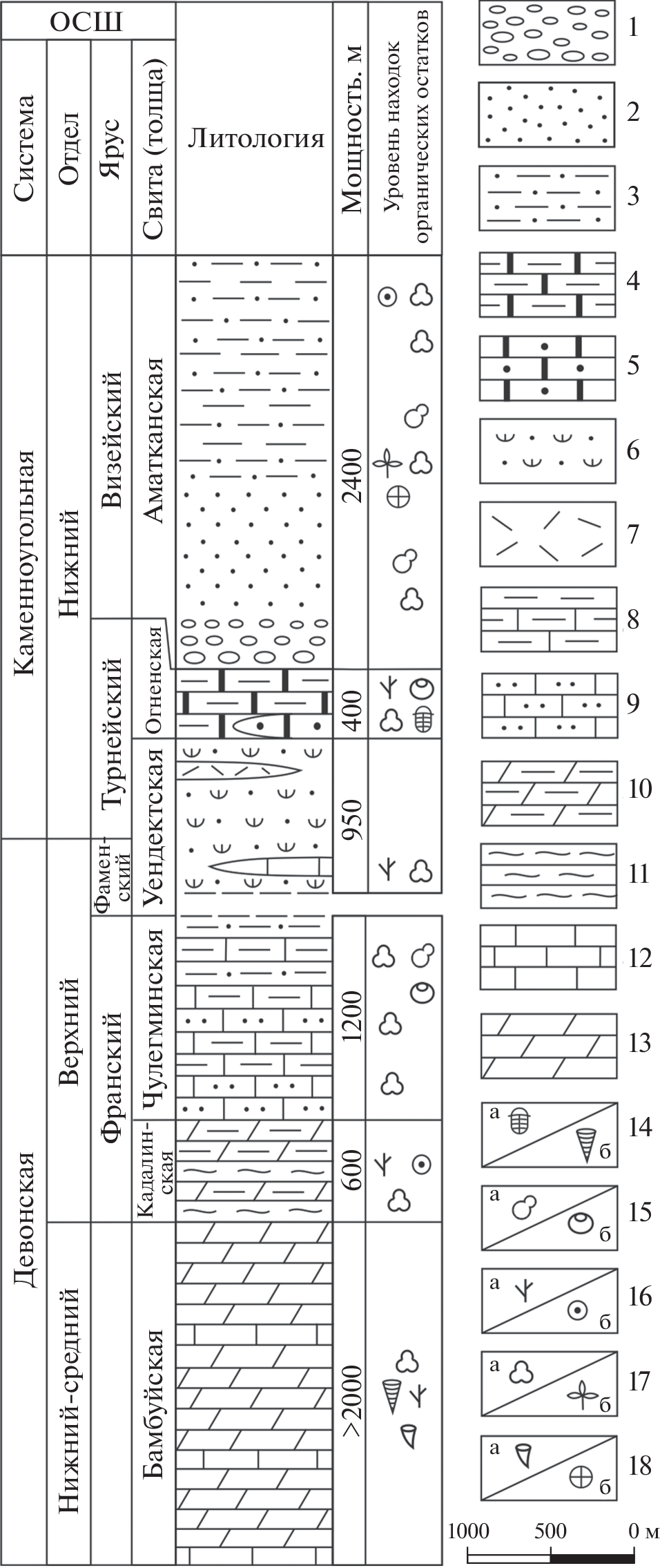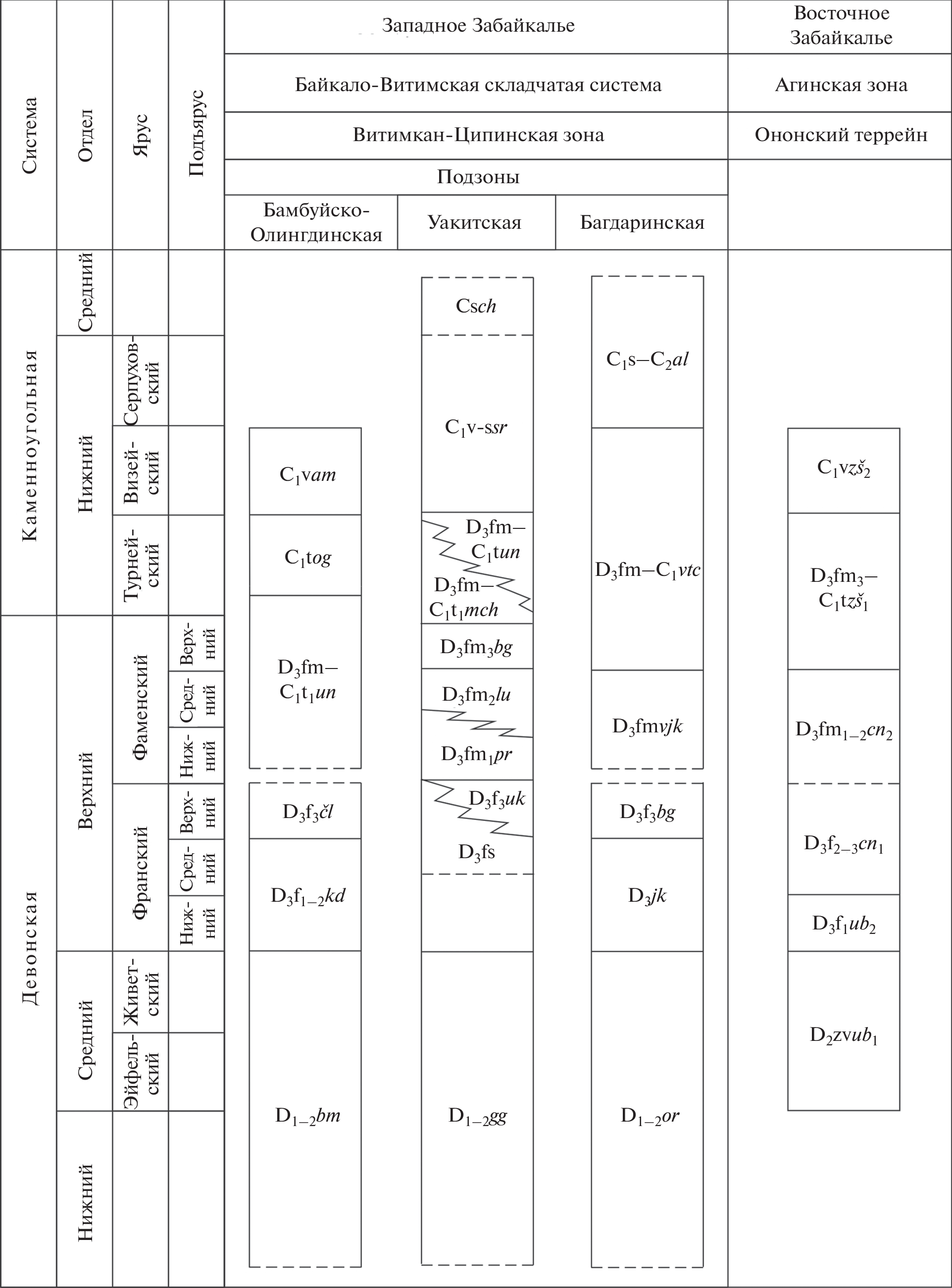 The results of biostratigraphic studies of the Devonian–lower Carboniferous deposits of the Bambui-Olingda subzone of the Vitimkan-Tsipinsk zone of the Baikal-Vitim fold system are presented. These deposits are isolated from the composition of the Riphean and Vendian–Cambrian formations. Their age was revised on the basis of numerous findings of fauna and flora. The carbonate Bambui and terrigenous Chulegma formations and the terrigenous-carbonate Kadalin stratum are assigned to the Devonian. The volcanogenic-terrigenous Yendekt sequence is dated as late Devonian (Famennian)–early Carboniferous (Tournaisian), while the terrigenous Ognenskaya and Amatkanskaya formations are dated as early Carboniferous (Tournaisian and Visean). Significant changes have been made to the Paleozoic stratigraphy scheme of the subzone. Paleolandscape reconstructions for the Bambui-Olingda basin and coastal land areas in the Devonian–early Carboniferous are proposed. The Devonian carbonate complex was formed in calm conditions of a shallow warm shelf sea. A change in the paleolandscape situation occurred at the Devonian–Carboniferous boundary. Sedimentation of significant thicknesses continued under the conditions of a deepening open shelf-slope paleobasin adjacent to the volcanic zone.