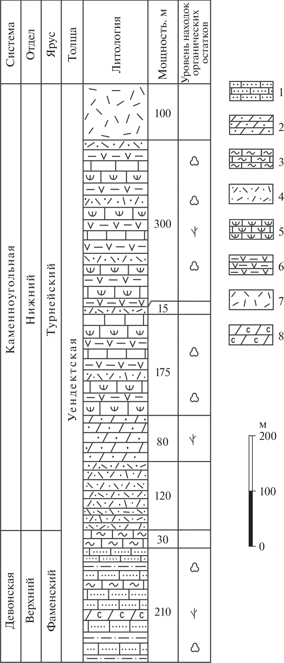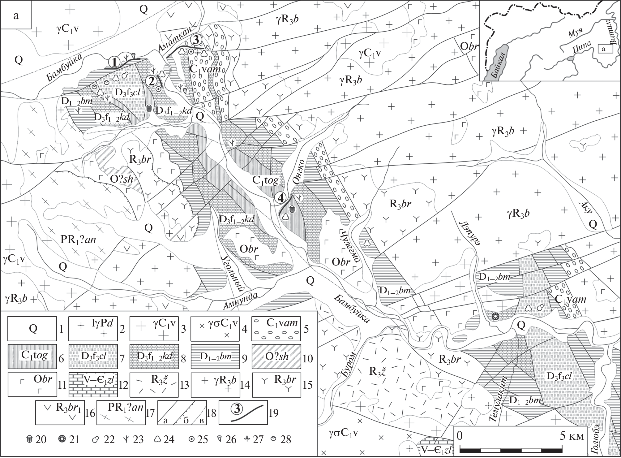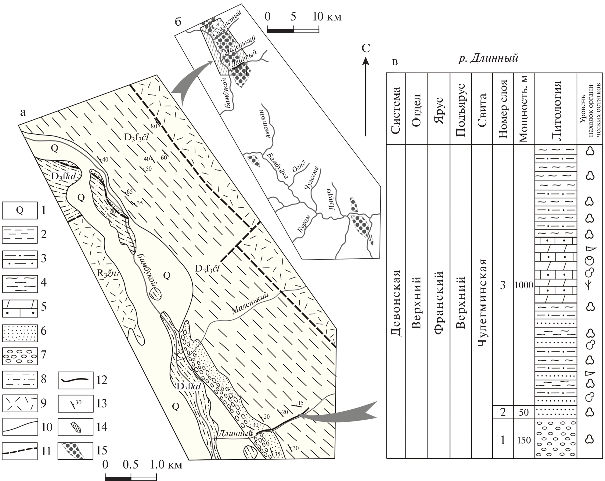 The results of biostratigraphic studies of the Devonian–lower Carboniferous deposits of the Bambui-Olingda subzone of the Vitimkan-Tsipinsk zone of the Baikal-Vitim fold system are presented. These deposits are isolated from the composition of the Riphean and Vendian–Cambrian formations. Their age was revised on the basis of numerous findings of fauna and flora. The carbonate Bambui and terrigenous Chulegma formations and the terrigenous-carbonate Kadalin stratum are assigned to the Devonian. The volcanogenic-terrigenous Yendekt sequence is dated as late Devonian (Famennian)–early Carboniferous (Tournaisian), while the terrigenous Ognenskaya and Amatkanskaya formations are dated as early Carboniferous (Tournaisian and Visean). Significant changes have been made to the Paleozoic stratigraphy scheme of the subzone. Paleolandscape reconstructions for the Bambui-Olingda basin and coastal land areas in the Devonian–early Carboniferous are proposed. The Devonian carbonate complex was formed in calm conditions of a shallow warm shelf sea. A change in the paleolandscape situation occurred at the Devonian–Carboniferous boundary. Sedimentation of significant thicknesses continued under the conditions of a deepening open shelf-slope paleobasin adjacent to the volcanic zone.