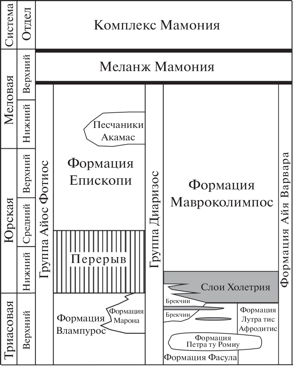 - Torley J.M., Robertson A.H.F. New evidence and interpretation of facies, provenance and geochemistry of late Triassic-early Cretaceous Tethyan deep-water passive margin-related sedimentary rocks (Ayios Photios Group), SW Cyprus in the context of eastern Mediterranean geodynamics // Sediment. Geol. 2018. V. 377. P. 82–110.