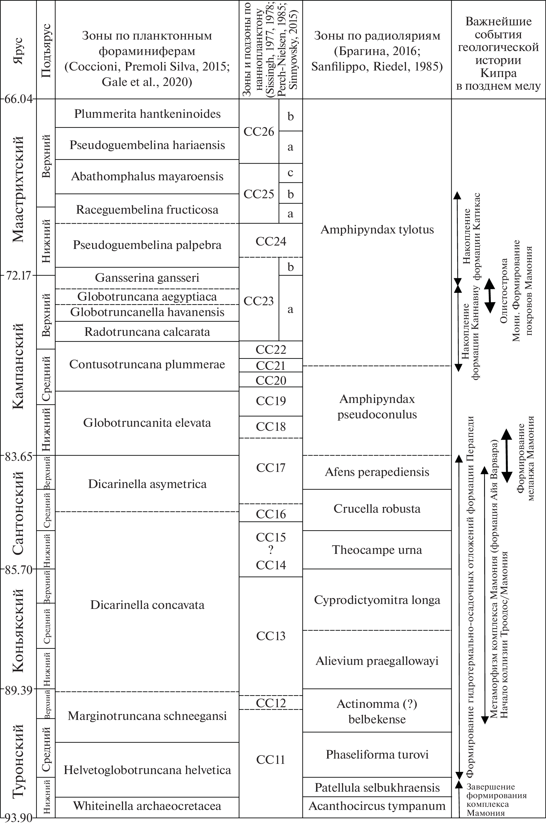 The Upper Cretaceous biostratigraphy (radiolarians and planktonic foraminifers) of Cyprus and stratigraphic position of several formations and units are detalized after long-time studies. Main geologic events are dated more precisely, main stages of Late Cretaceous geological history of Cyprus are proposed: (1) early Turonian: completing of sedimentation and formation of the Mamonia Complex; (2) middle Turonian–early Campanian: collision of Troodos and Mamonia complexes, metamorphism of Mamonia units and hydrothermal activity of Troodos Complex, after it – formation of the Mamonia Mélange and beginning of development of Mamonia nappes; (3) middle to late Campanian: formation of Kyrenian volcanic arc, deposition of pyroclastic sediments of the Kannaviou Formation, and in the end of stage – completing of Mamonia nappes and deposition of the Moni Formation (olistostrome); (4) latest Campanian–middle part of Maastrichtian: deposition of the Kathikas Formation (debris flows) during erosion of underwater relief, formed by the development of Mamonia nappe system; (5) late Maastrichtian: domination of deep-water carbonate deposition (the Lefkara Formation).