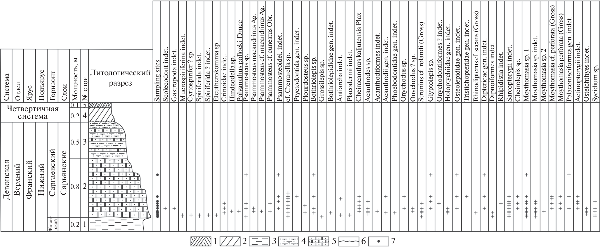 The article provides a lithological description of the sections of the Lower Frasnian Stage of the Upper Devonian: the Zhelon Regional Stage and the Saria Beds of the Sargaevo Regional Stage, exposing in the basin of the Saryanka river, the Latvian Saddle. The complete lithological description of the Sargaevo and Semiluki sediments of the Frasnian Stage in the Gralevo quarry of the Vitebsk region, Orsha Depression has been presented. Macro- and micro-dimensional remains of heterostracans, placoderms, acanthodians, sarcopterygians, actinopterygians, as well as scolecodonts and conodonts have been found in the Lower Frasnian sediments; their photographic images are presented. For the first time, the Sr isotope composition was measured in the remains of ichthyofauna from the Zhelon and Sargaevo sediments of Belarus. On the basis of palaeoichthyological and taphonomic data, lithology and Sr isotope composition of ichthyofauna fragments, depositional environments in the Zhelon and Saria times were clarified, and the distant sections were correlated. The 87Sr/86Sr values in ichthyofauna samples from the Saria Beds in sections of the Latvian Saddle (sections of Kalyuty 5a and 6, Virenka 1) and the Orsha Depression (Gralevo quarry) lie within similar ranges: 0.70825–0.70842 and 0.70837–0.70856, respectively. The 87Sr/86Sr values in the ichthyofauna from the Zhelon sediments in the Kalyuty 2 and Obukhovo 1 sections (Latvian Saddle) vary within 0.70898–0.70932 and 0.71065–0.71102, respectively. High 87Sr/86Sr values in the fossil ichthyofauna of both regional stages suggest that the Early Frasnian palaeobassin was significantly desalinated, and the salinity in the Saria palaeobassin was comparable to the salinity of the modern Baltic Sea.