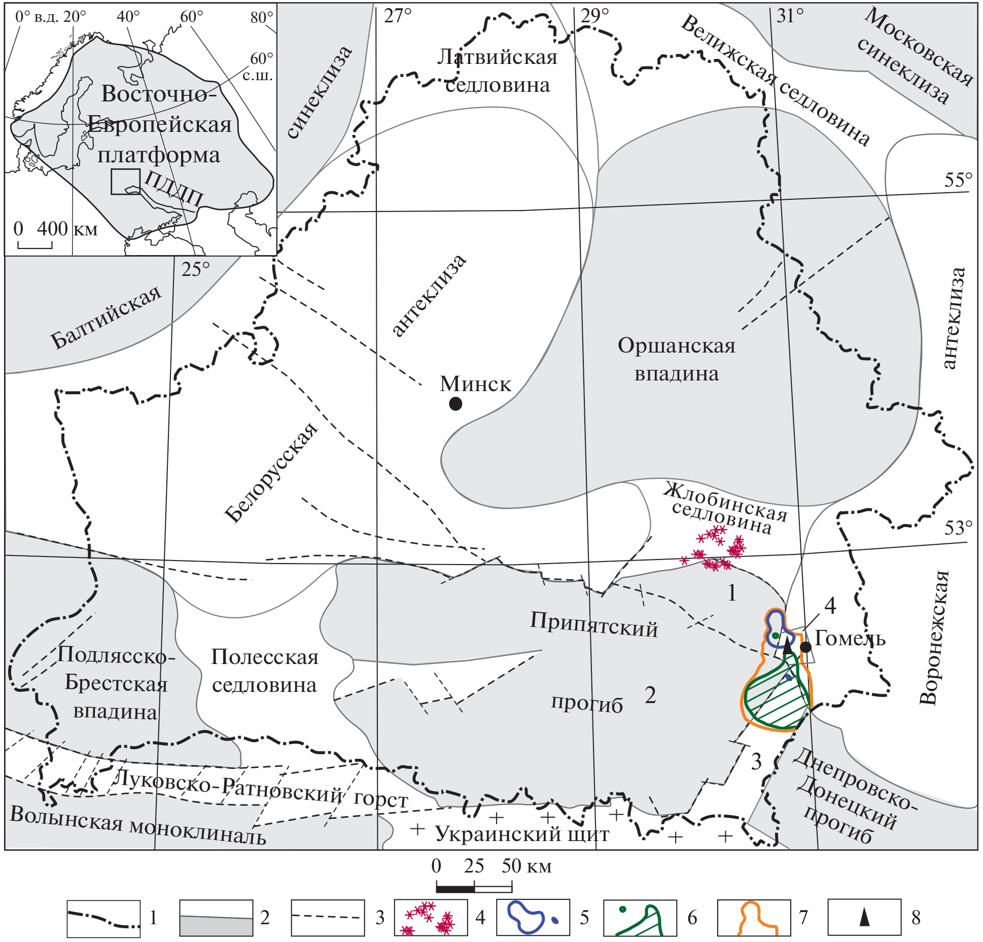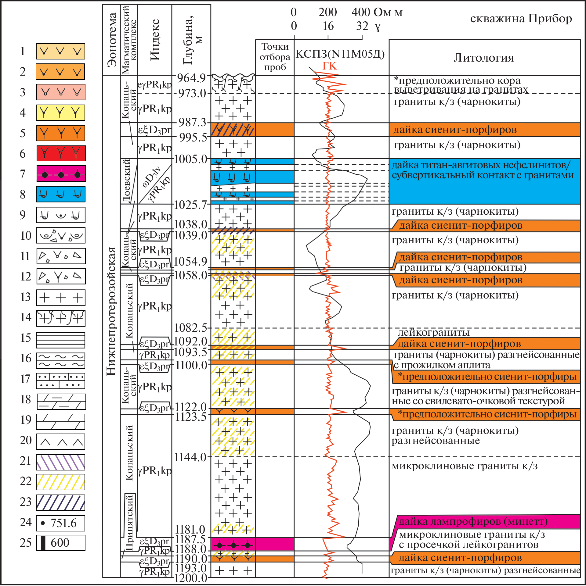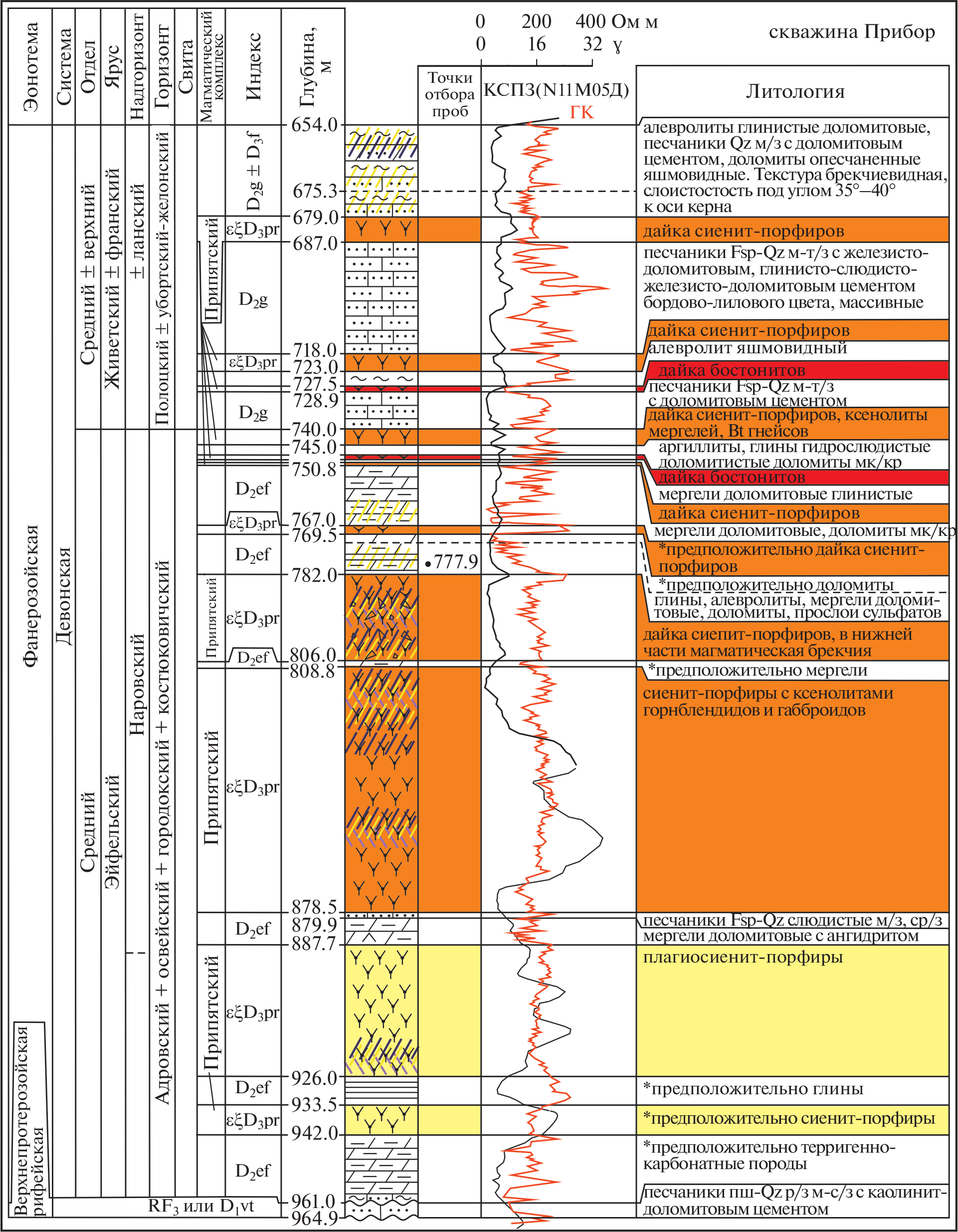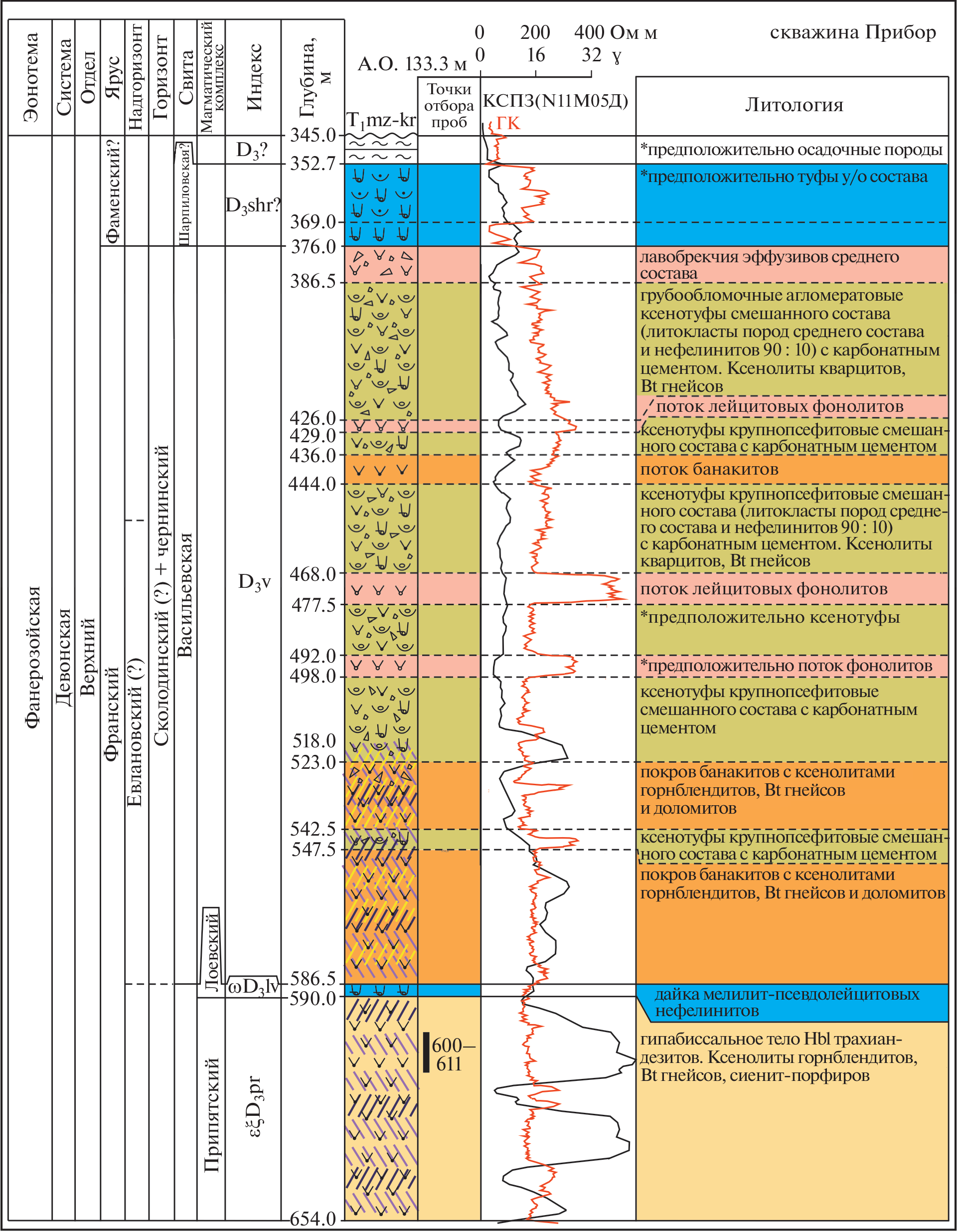 На основе минералого-петрографического и геохимического изучения магматических пород среднего состава припятского комплекса позднедевонской Припятско-Днепровской области магматизма сделан вывод о существовании двух подфаз припятской фазы магматизма: позднефранской (чернинской или сколодинско-чернинской) с калиевой спецификой и раннефаменской (туровско-дроздовской (елецкой)) с калиево-натриевой спецификой. Впервые для пород Припятско-Днепровской области получен U–Pb возраст титанита из трахиандезитов параметрической скважины Прибор – 364 ± 1 млн лет. Эти данные подтверждают фаменский возраст елецкой подфазы припятской фазы магматизма и позволяют определить, с учетом оценок возраста ранних фаз магматизма Припятско-Днепрово-Донецкой палерифтовой структуры 388 ± 12 млн лет, 383.3 ± 3.8 млн лет, 384.7 ± 3.9 млн лет и 383.6 ± 4.4 млн лет в ее Приазовской части и 381 ± 2 млн лет в Припятско-Днепровской области магматизма, продолжительность магматической активности этой рифтовой структуры по меньшей мере в 14 млн лет.