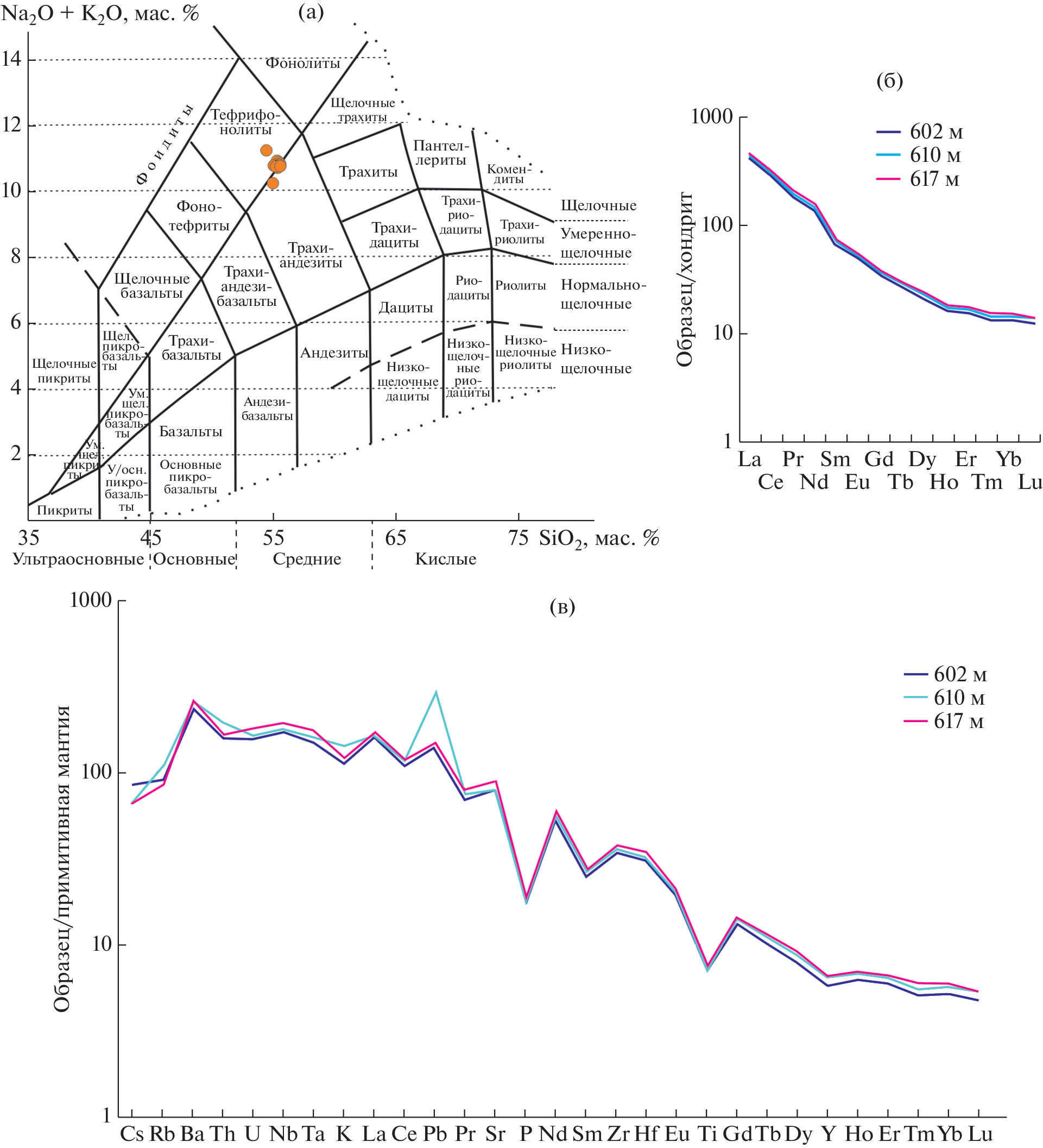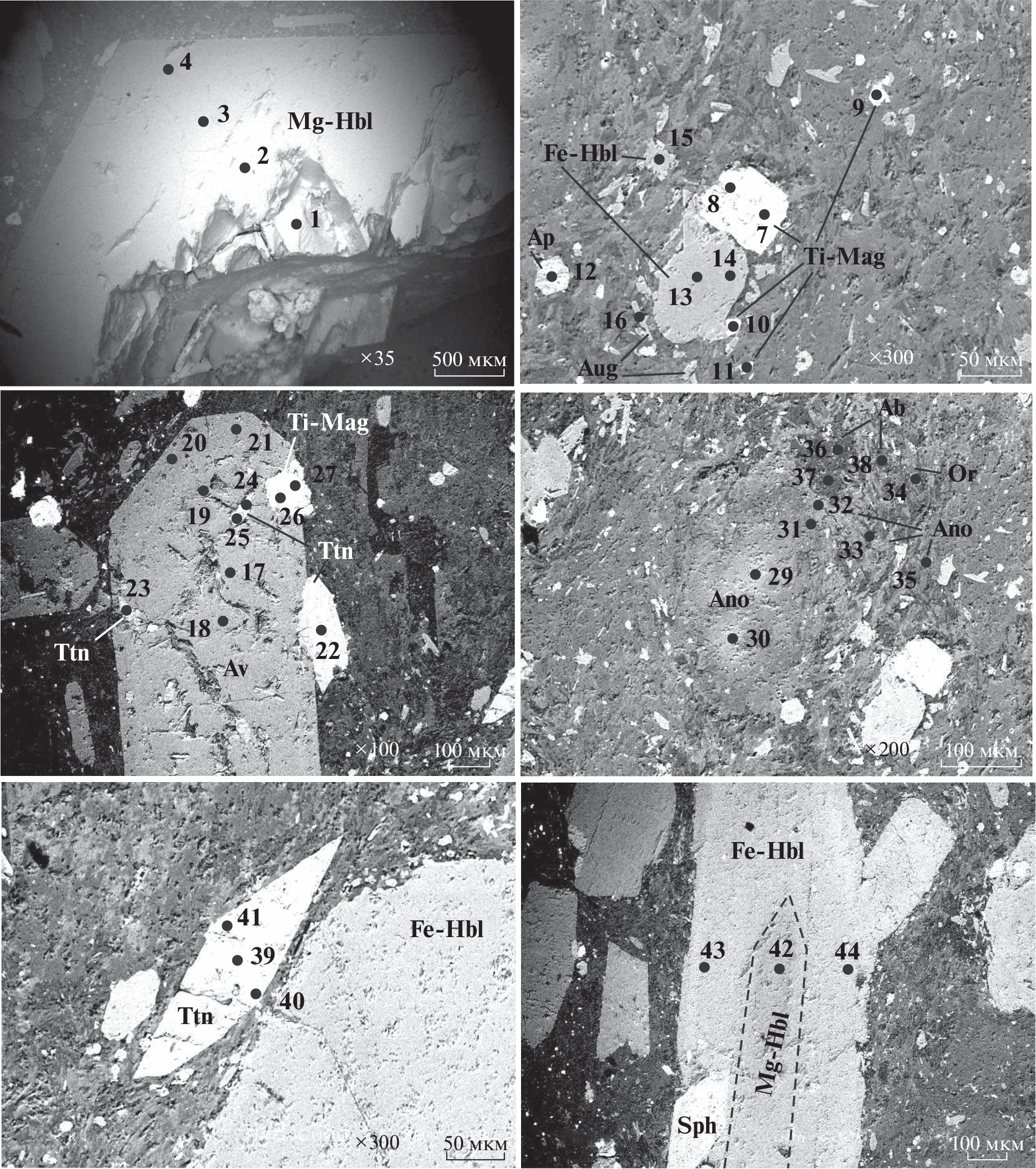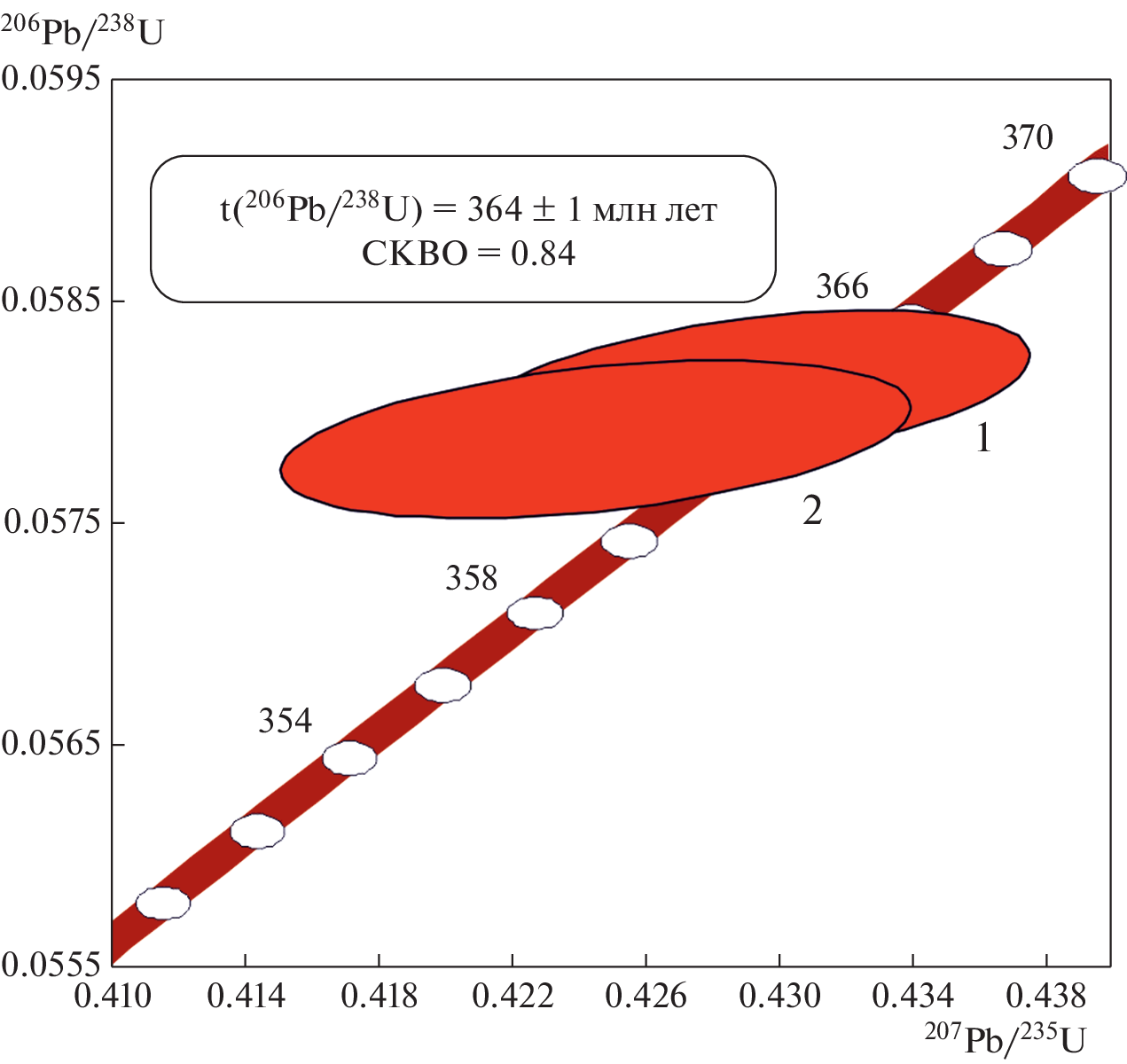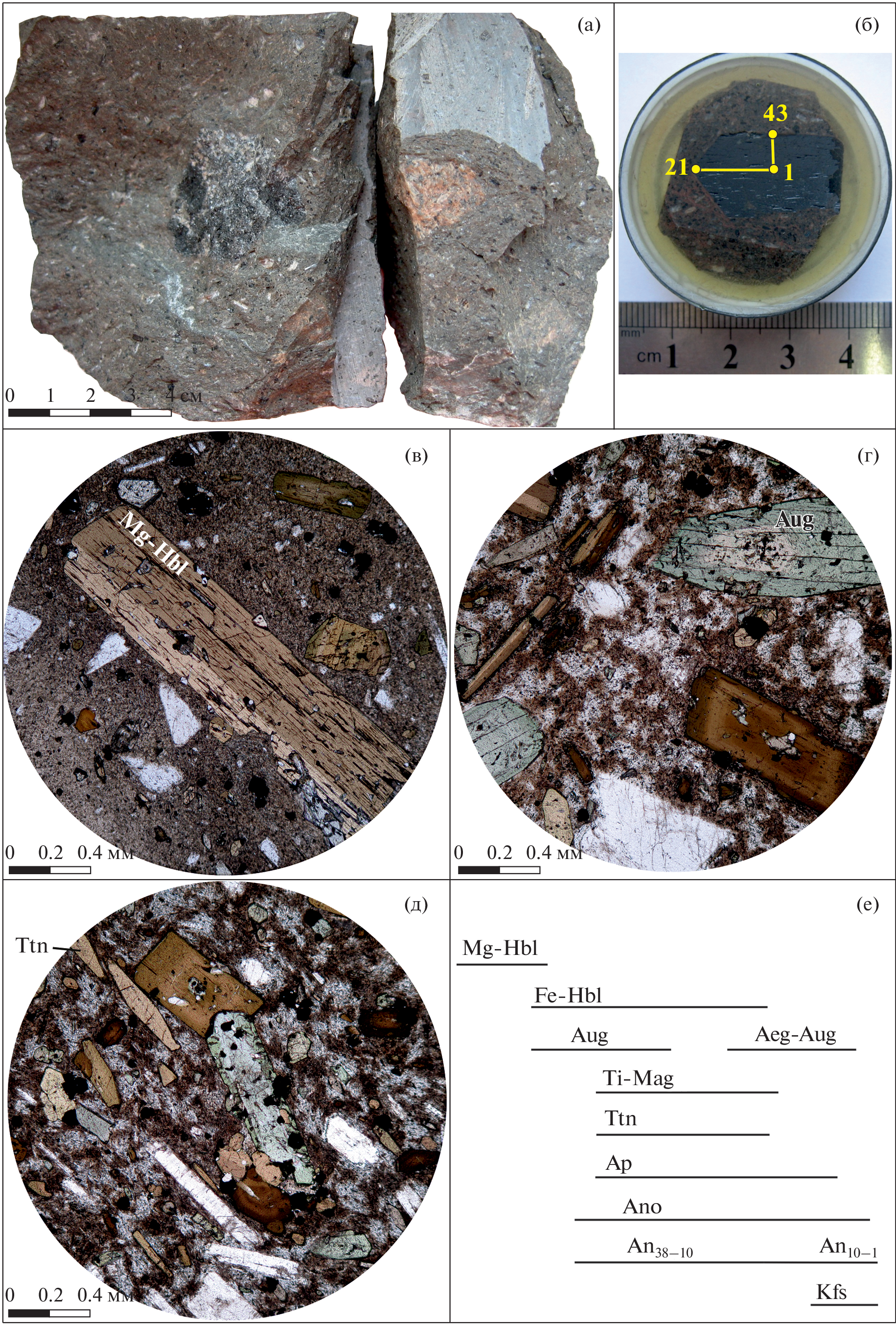 На основе минералого-петрографического и геохимического изучения магматических пород среднего состава припятского комплекса позднедевонской Припятско-Днепровской области магматизма сделан вывод о существовании двух подфаз припятской фазы магматизма: позднефранской (чернинской или сколодинско-чернинской) с калиевой спецификой и раннефаменской (туровско-дроздовской (елецкой)) с калиево-натриевой спецификой. Впервые для пород Припятско-Днепровской области получен U–Pb возраст титанита из трахиандезитов параметрической скважины Прибор – 364 ± 1 млн лет. Эти данные подтверждают фаменский возраст елецкой подфазы припятской фазы магматизма и позволяют определить, с учетом оценок возраста ранних фаз магматизма Припятско-Днепрово-Донецкой палерифтовой структуры 388 ± 12 млн лет, 383.3 ± 3.8 млн лет, 384.7 ± 3.9 млн лет и 383.6 ± 4.4 млн лет в ее Приазовской части и 381 ± 2 млн лет в Припятско-Днепровской области магматизма, продолжительность магматической активности этой рифтовой структуры по меньшей мере в 14 млн лет.