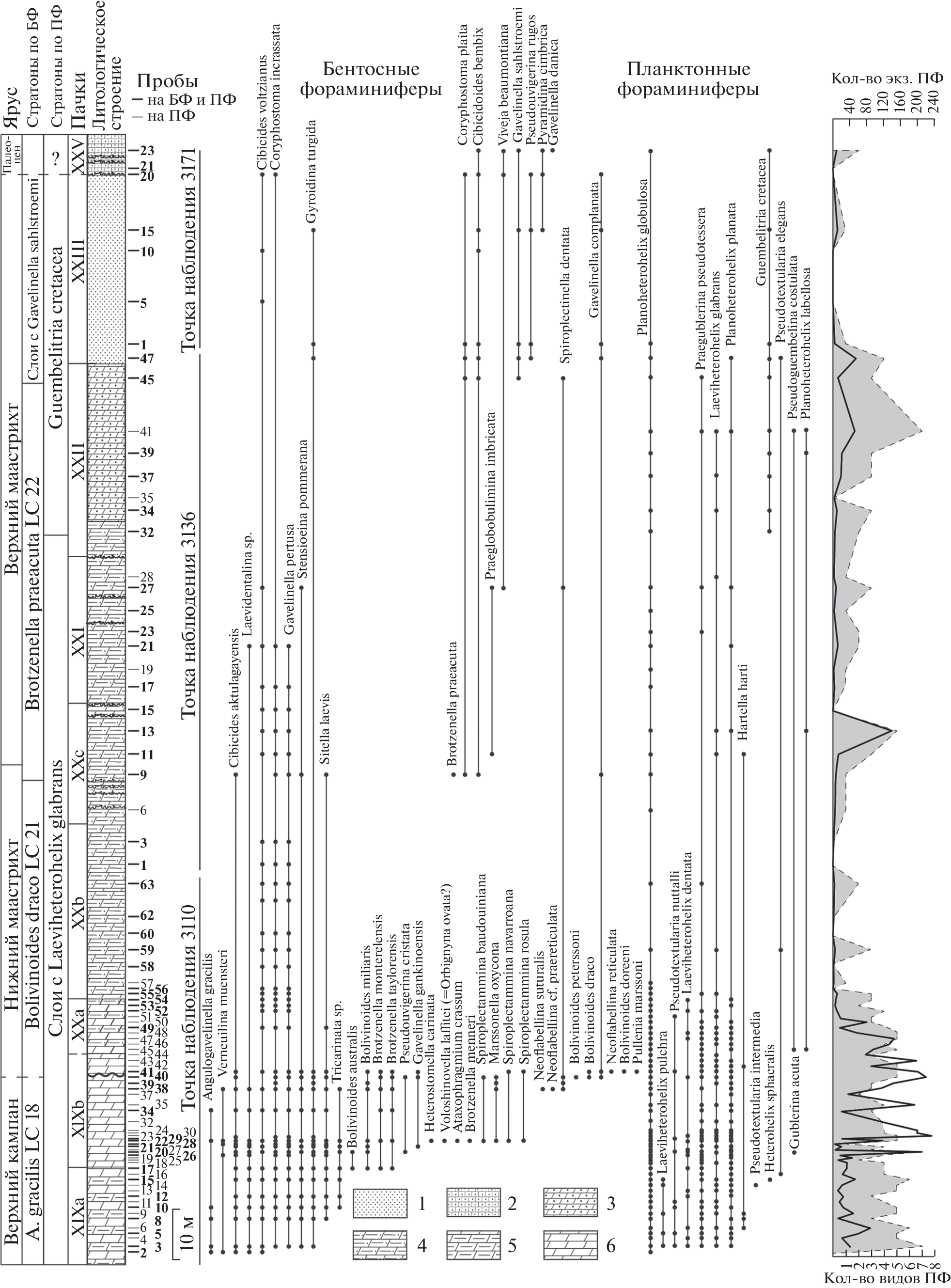 New data on the taxonomic composition and stratigraphic distribution of benthic and planktonic foraminifera in the Campanian–Maastrichtian interval of the Beshkosh section (Southwestern Crimea) are presented. Samples were collected according to “sample-to-sample” system for different types of analysis. According to the foraminiferal analyses, zones and beds were established. Angulogavelinella gracilis LC 18 Zone, Bolivinoides draco LC 21 Zone, Brotzenella praeacuta LC 22 Zone and Beds with Gavelinella sahlstroemi by benthic foraminifera and Beds with Laeviheterohelix glabrans, Guembelitria cretacea Zone by planktonic foraminifera were identified. All biostratons are correlated with magnetostratigraphics, palynomorphs and macrofauna’s events. Beds and zones by benthic foraminifera are correlated with Campanian–Maastrichtian bioevents in sections of the European paleobiogeographic region. Planktonic foraminifera data are compared with International Stratigraphic Scale (Tethys region) and the regional stratigraphic scheme of Poland. For the first time, 15 species of 9 planktonic foraminifera genera and 38 species (25 of which are for the first time) of 25 benthic foraminifera genera in the Beshkosh section have been identified.