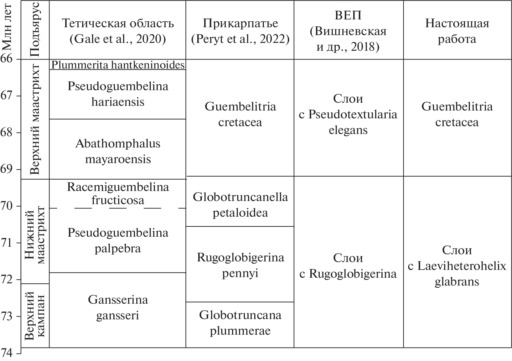 - Arz J.A., Arenillas I., Náñez C. Morphostatistical analysis of Maastrichtian populations of Guembelitria from El Kef, Tunisia // J. Foraminiferal Res. 2010. V. 40. № 2. P. 148–164.