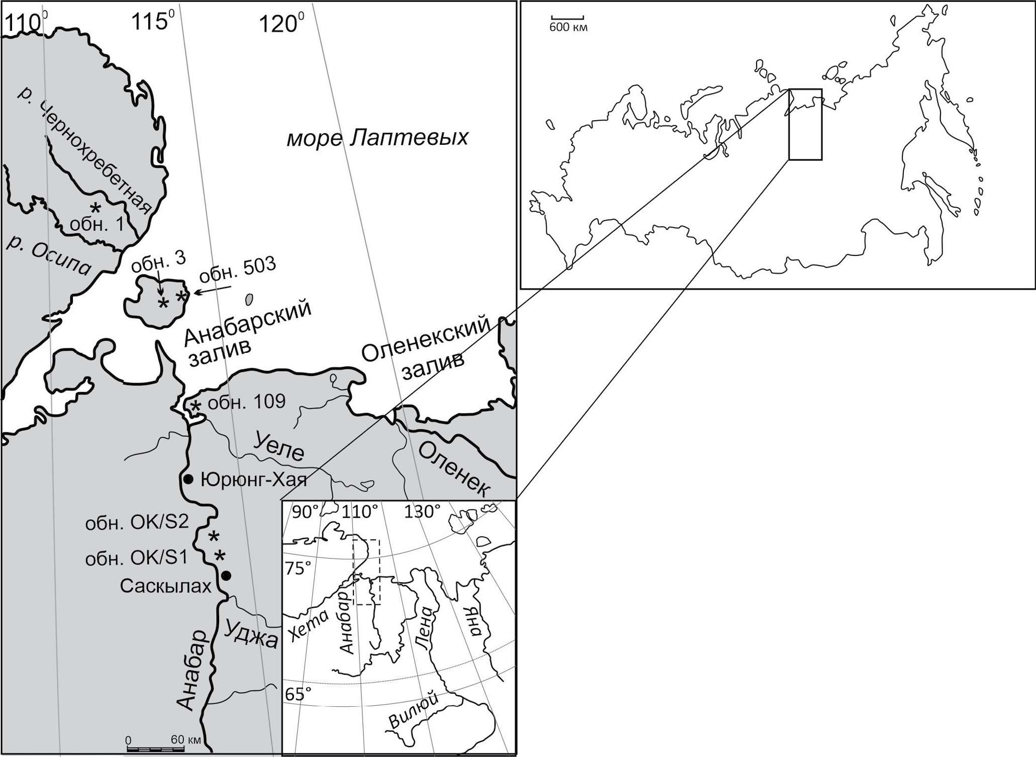 Остров Большой Бегичев. На о-ве Большой Бегичев, по данным С.В. Мелединой (1977), отмечается наиболее полная таксономическая характеристика зоны Subordinarium и проводится ее нижняя граница с зоной Keyserlingi. Непрерывная последовательность пород вскрывается в береговом обнажении (обн. 503, рис. 1). Однако весь аммонитовый комплекс, приводимый во многих публикациях в качестве характерного для зоны Subordinarium, был обнаружен в изолированном обнажении на р. Иннокентьевка (обн. 3) (Меледина, 1977, с. 184). Авторы настоящей статьи (Князев и др., 2020; Князев, Алифиров, 2022), а также Д.Н. Киселев (2022) пришли к выводу о том, что аммониты из обн. 3 на р. Иннокентьевка позволяют отнести вмещающую толщу к среднему келловею.