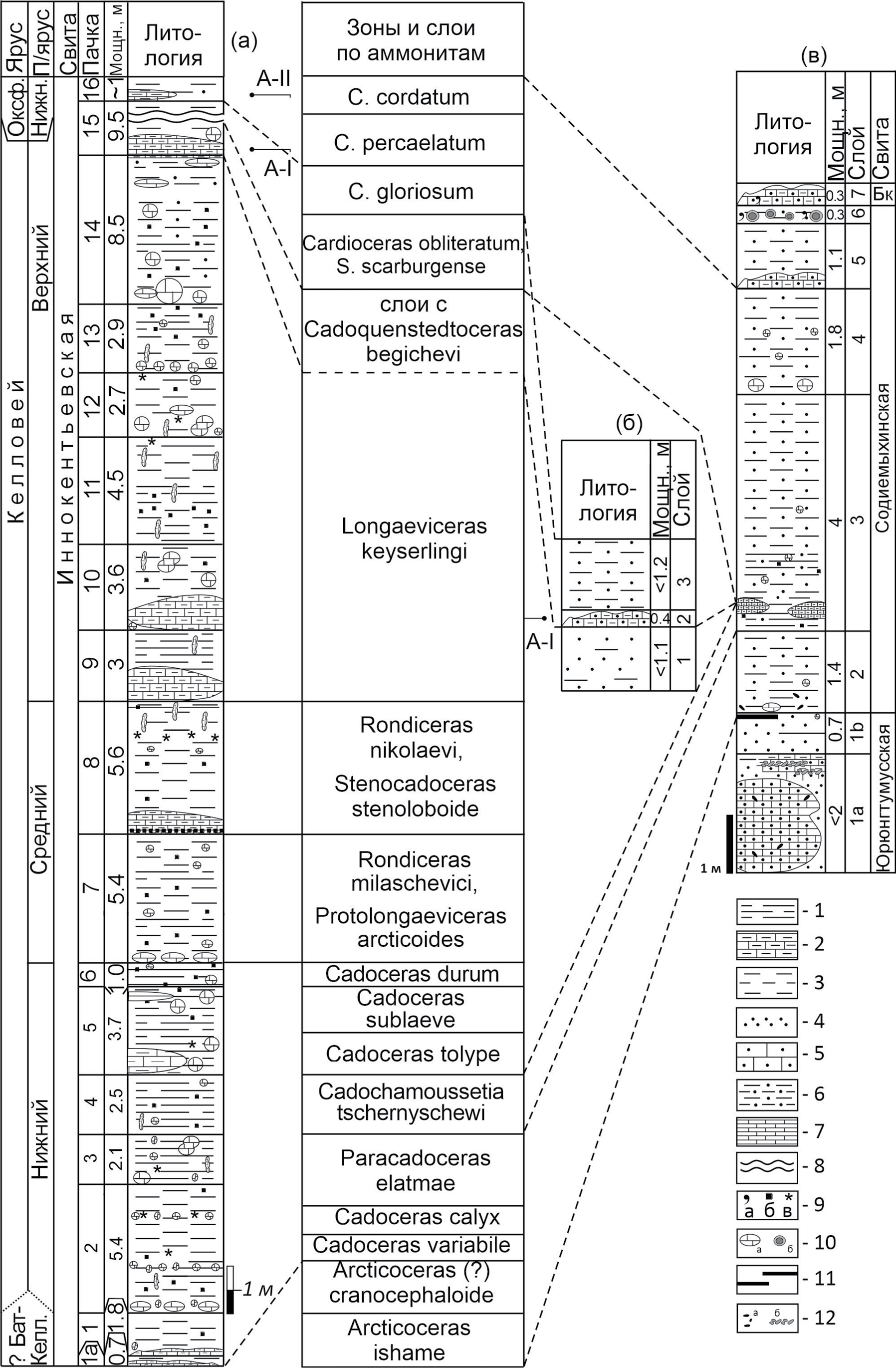 1 — глины алевритовые; 2 — алевролиты известковистые; 3 — алевролиты; 4 — пески; 5 — песчаники известковистые; 6 — пески алевритовые; 7 — известняки и мергели; 8 — разрыв масштаба; 9а — глауконит, 9б — пирит, 9в — глендониты; 10 — конкреции: а — известковистые, б — фосфатные; 11 — углистые прослои; 12а — галька, 12б — брекчированные породы. Сокращения: Бк — буолкалахская свита, А-I — Cadoquenstedtoceras begichevi, A-II — Cardioceras praecordatum