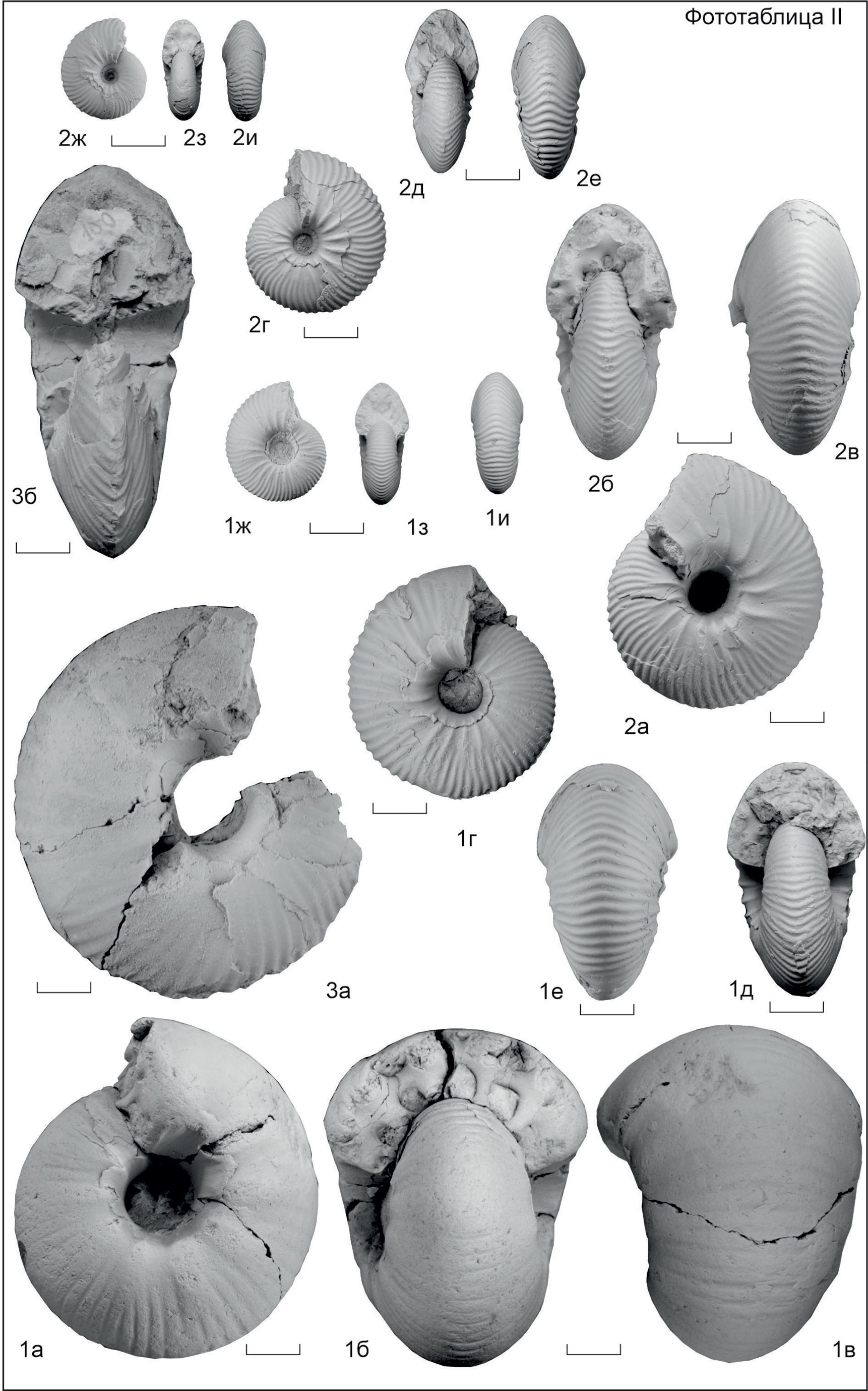 Таблица II. 1, 2 — Cadoquenstedtoceras begichevi Knyazev et Alifirov, 2022: 1а–1з — экз. № 2060/14: 1а, 1г, 1ж — вид сбоку, 1б, 1д, 1з — поперечное сечение, 1в, 1е, 1и — вид с вентральной стороны; 2а–2з — экз. № 2060/15: 2а, 2г, 2ж — вид сбоку, 2б, 2д, 2з — поперечное сечение, 2в, 2е, 2и — вид с вентральной стороны; о-в Большой Бегичев, обн. 503, осыпь, верхний келловей, слои с Cadoquenstedtoceras begichevi; 3 — Soaniceras cf. angustatum (Meledina, 1977): 3а–3б — экз. № 2060/102: 3а — вид сбоку, 3б — поперечное сечение, р. Анабар, обн. OK/S2, слой 3, 0.4 м выше подошвы, нижний оксфорд, зона Cardioceras obliteratum–Cardioceras scarburgense