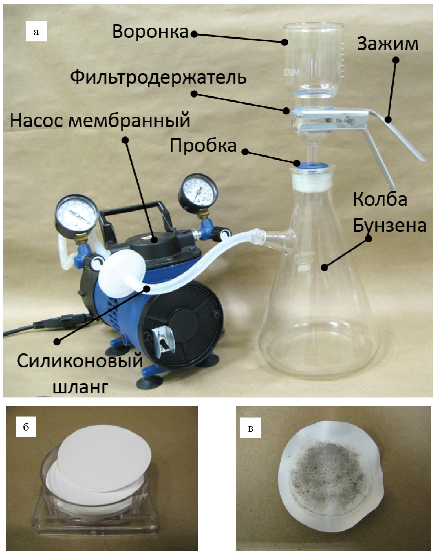 Рис. 2. (а) Вакуумная система фильтрации с использованием фильтров МФАС-П-4 (Владипор), (б) фильтры, (в) фильтры с полученным осадком