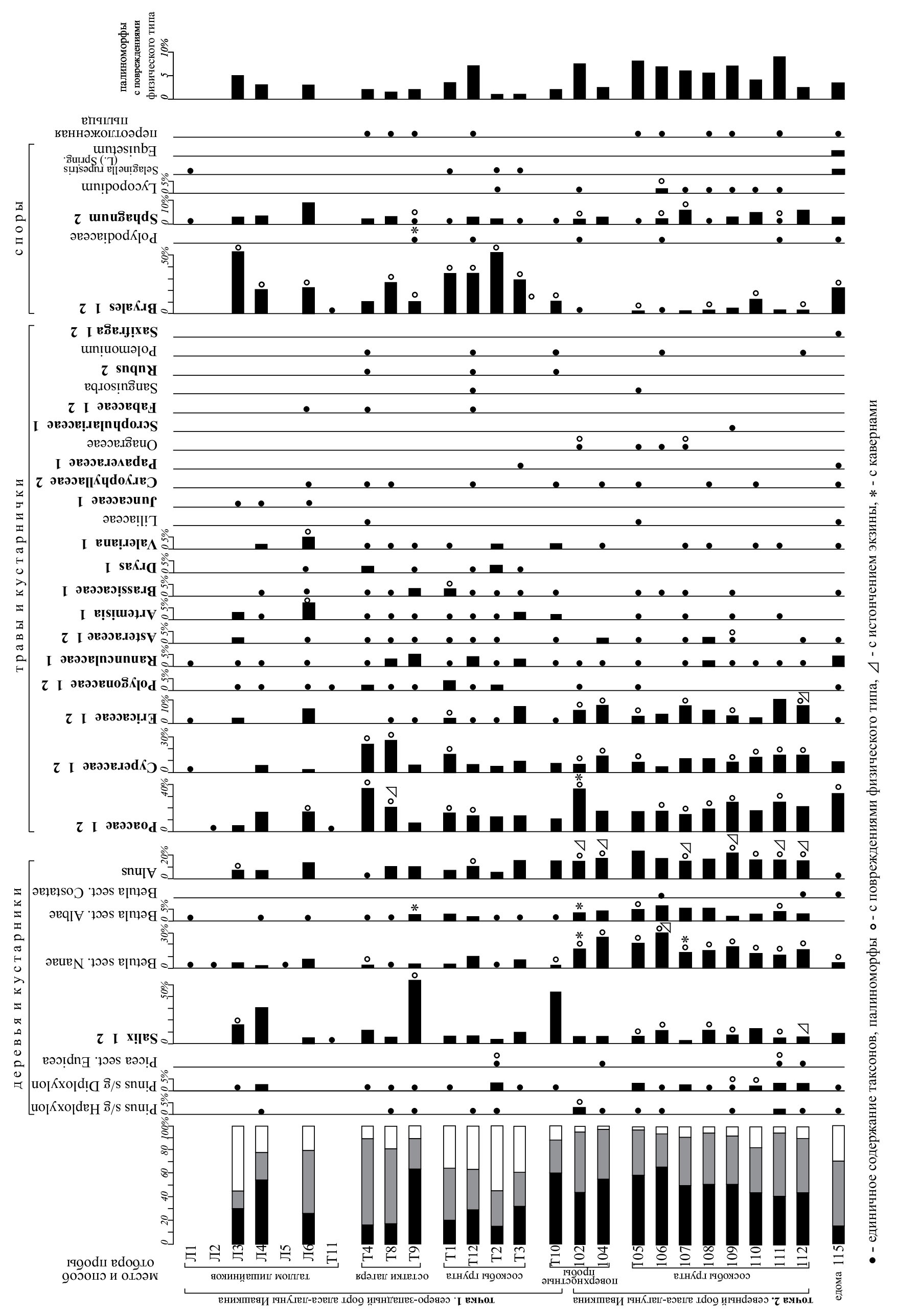 Пыльца Salix, единственного представителя кустарниковой растительности, составляет от 3 до 47.5%, но в большинстве спектров не превышает 10%. Ее максимальное содержание зафиксировано в спектрах четырех проб точки 1, три из которых взяты не с поверхности грунта, а из осадка, накопленного за несколько лет на талломе лишайников и остатках лагеря. Отметим, что в спектрах проб Т1, Т4, Т3 и 105, отобранных непосредственно возле кустарников Salix glauca или S. polaris, содержание пыльцы ивы колеблется в пределах 6–11%.
