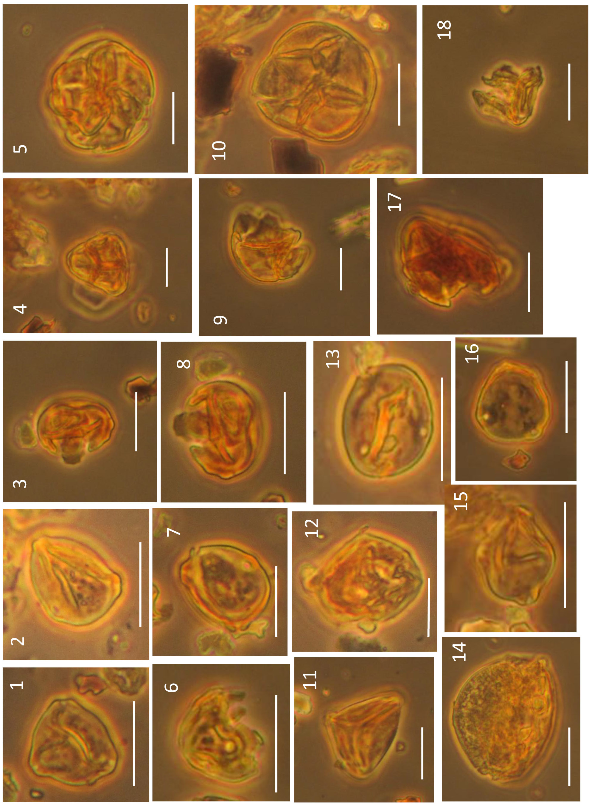 1, 2, 13, 15, 16 – Betula sect. Nanae; 3, 6–8 – Betula sect. Nanae с повреждениями; 4 – Ericaceae; 5, 9, 10, 17 – Ericaceae с повреждениями; 11 – Sphagnum; 12 – Poaceae; 14 – Pinus s/g Haploxylon; 18 – Alnus. Длина масштабной линейки 20 мкм