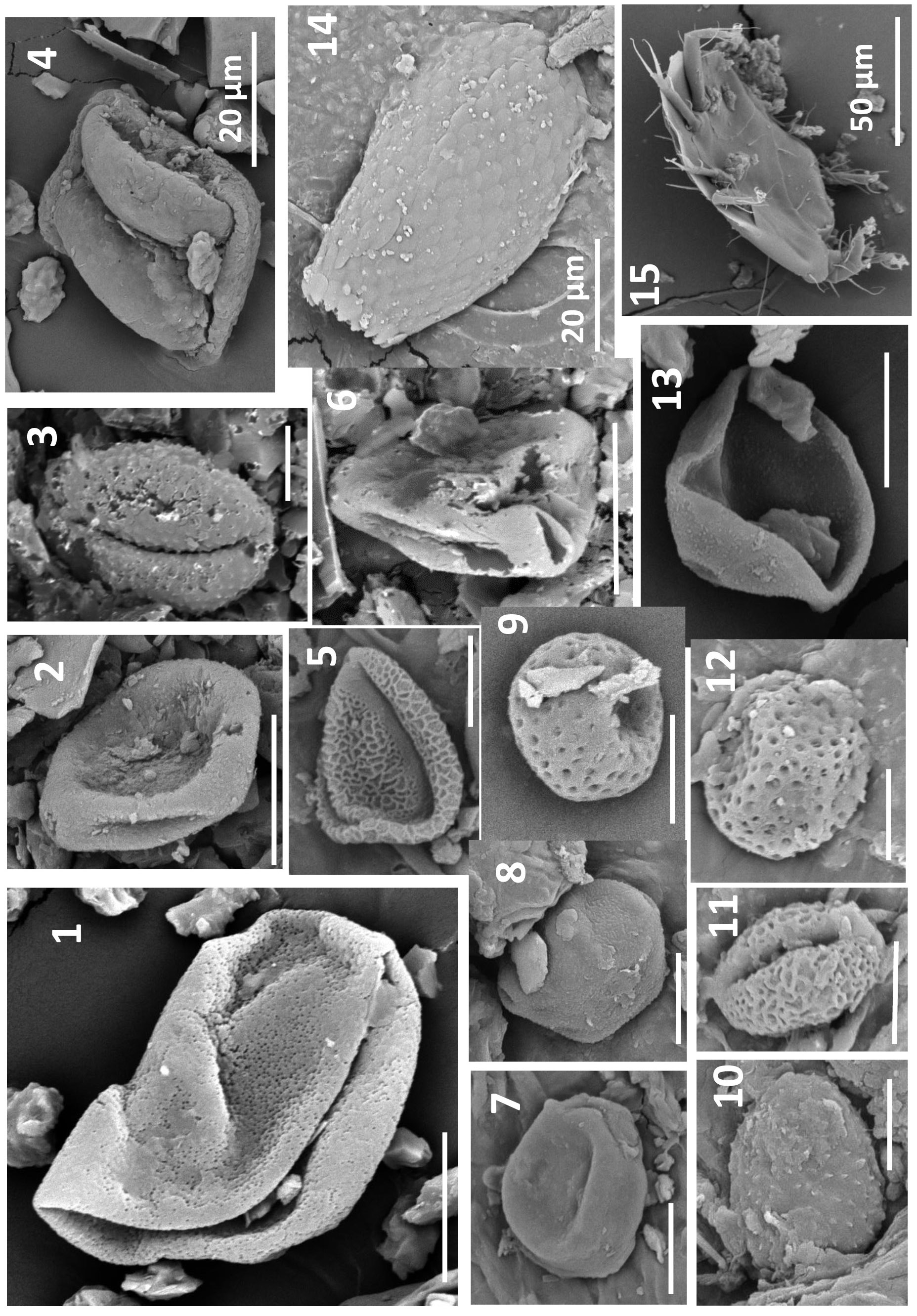 1 – Cyperaceae; 2 – Poaceae; 3 – Asteraceae с разрывами и кавернами; 4 – Pinus s/g Haploxylon; 5, 11 – Salix; 6 – Cyperaceae с разрывами; 7 – Betula sect. Nanae; 8 – Alnus; 9, 12 – Bryales; 10 – Asteraceae; 13 – Poaceae смятая; 14 – раковинная амеба; 15 – остатки насекомого. Длина масштабной линейки 10 мкм