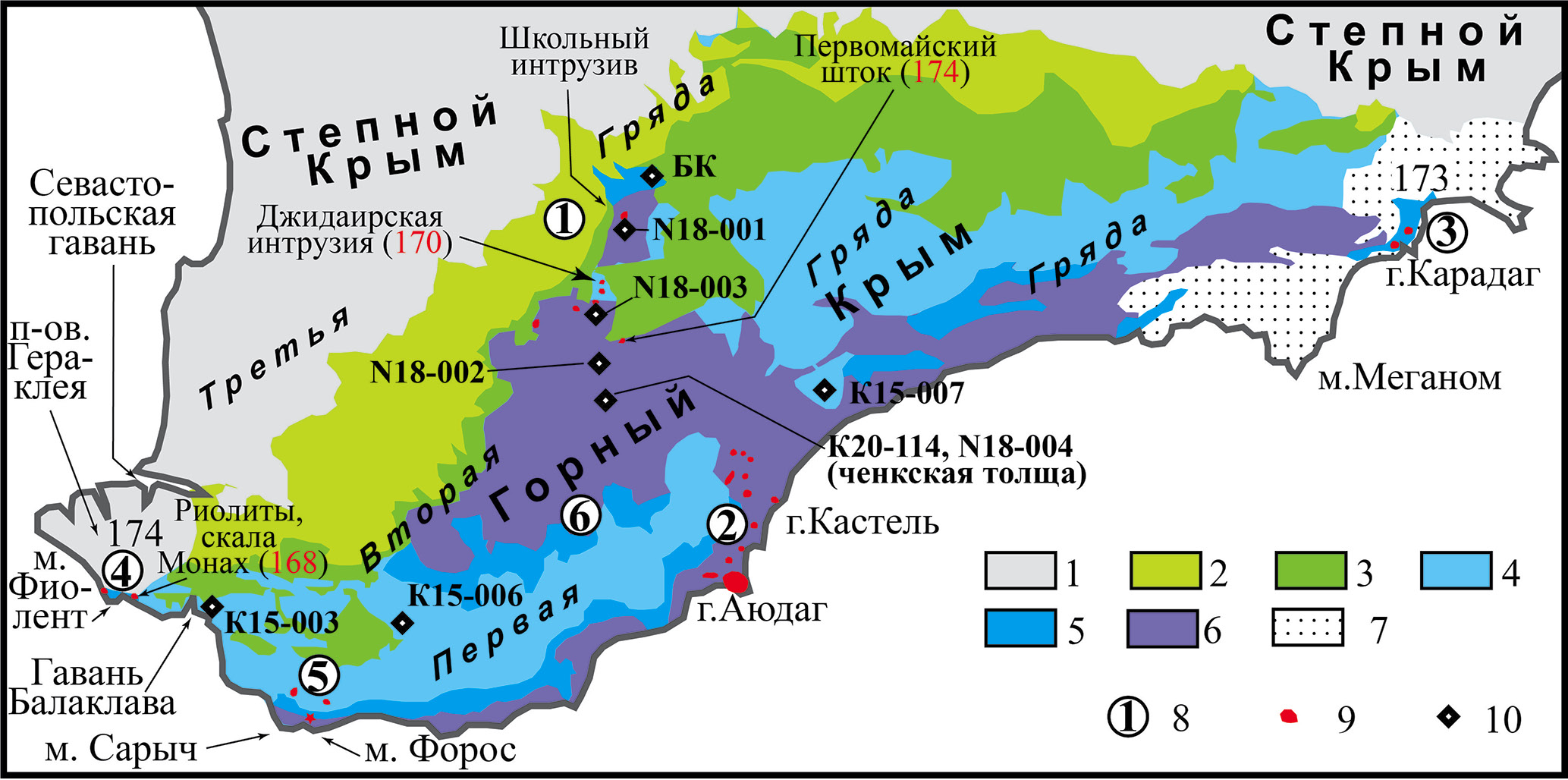 1–3 – синальпийский структурный комплекс: 1 – верхнекайнозойские толщи осадочных терригенно-глинисто-карбонатных пород, слагающие Третью гряду Крымских гор и верхние части разреза регионов Скифской плиты, попадающих в пределы Степного Крыма; 2 – верхнемеловые и нижнекайнозойские толщи осадочных глинисто-карбонатных и карбонатных пород, слагающие верхние части разреза Второй гряды Крымских гор; 3 – нижнемеловые толщи осадочных терригенных пород, слагающие нижние части разреза Второй гряды Крымских гор; 4–6 – киммерийский структурный комплекс: 4 – верхнеюрские (верхнеюрско-берриасские) толщи карбонатных, карбонатно-обломочных и терригенных грубообломочных (конгломератов) пород, слагающие вершинные платообразные части Первой гряды Крымских гор; 5 – среднеюрские толщи вулканогенных, вулканогенно-осадочных, терригенных (конгломераты, песчаники) пород и угленосные толщи, слагающие склоны Первой гряды Крымских гор; 6 – верхнетриасово-нижнеюрские флишевые толщи – таврическая и эскиординская серии, слагающие структурное основание Первой и Второй гряд Крымских гор; 7 – карбонатно-глинисто-терригенные толщи, охватывающие стратиграфический интервал келловей–неоген, развитые на востоке Крымских гор; 8 – магматические ареалы (1 – Бодрак-Первомайский, 2 – Аюдаг-Кастель, 3 – Карадаг, 4 – Фиолент-Гераклея, 5 – Сарыч-Форос-Олива, 6 – Верхняя Кача); 9 – среднеюрские магматиты (для некоторых объектов цифрами даны возрасты в млн лет, красный шрифт – U–Pb датирование, черный шрифт – Ar–Ar или K–Ar датирование); 10 – положение мест отбора проб песчаников из триасовых и юрских толщ киммерийского структурного комплекса Горного Крыма, для которых на сегодняшний день известны результаты датирования зерен детритового циркона