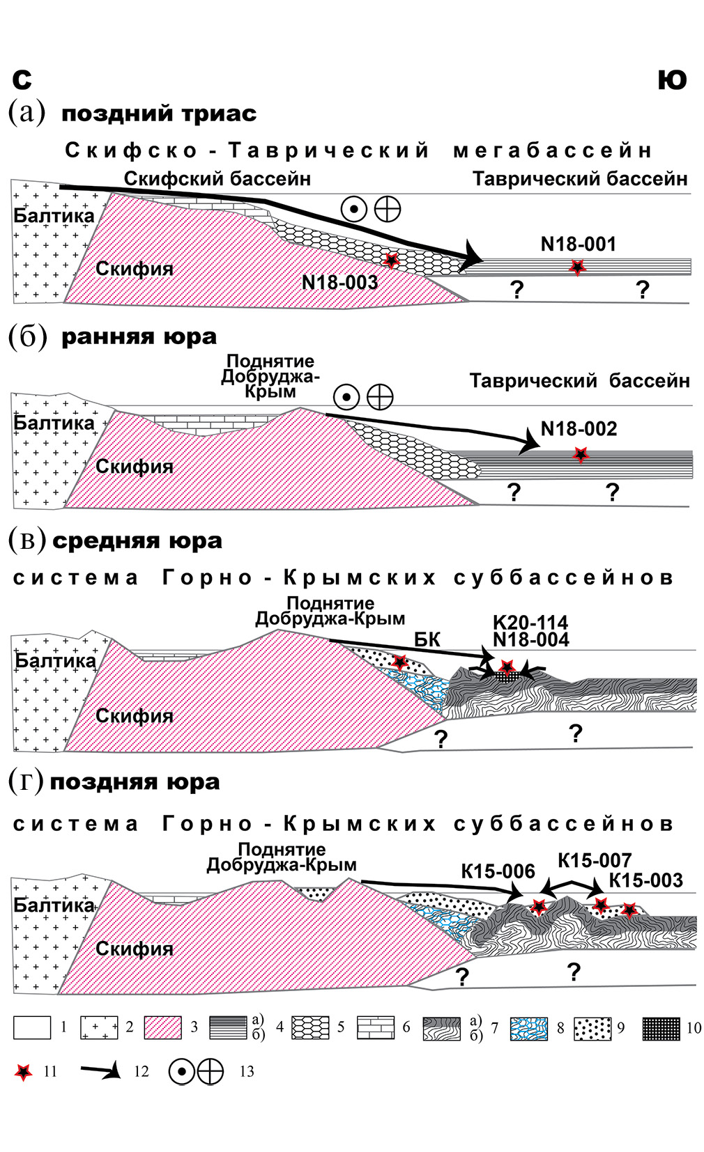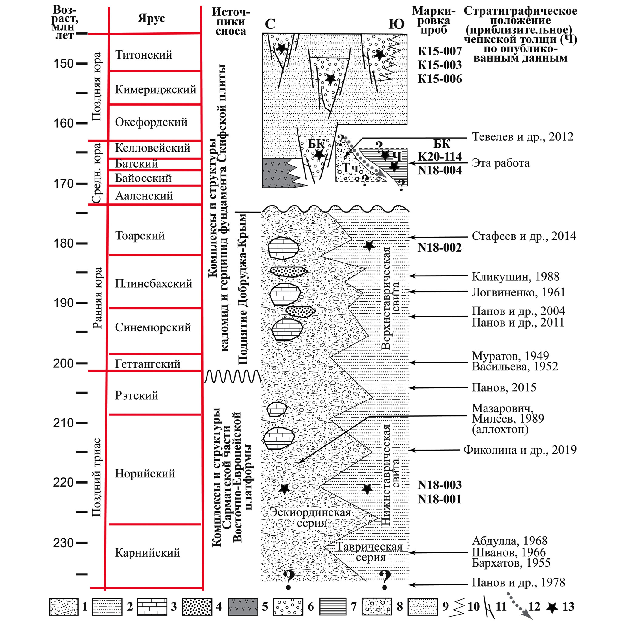 1 – эскиординская серия; 2 – таврическая серия; 3, 4 – блоки (пластовые отторженцы), олистолиты и олистоплаки в олистостромах эскиординской серии: 3 – каменноугольных, пермских и триасовых известняков; 4 – триасовых(?) и юрских песчаников; 5 – вулканогенные и туфогенные образования района мыса Фиолент, Трудолюбовка (бодракская свита), пос. Форос, горного массива Карадаг (карадакская серия); 6 – песчаные и грубокластические (конгломератовые) аллювиальные, дельтовые и мелководно-морские отложения, местами с прослоями углей, сформированные в небольших тектонически ограниченных пулл-апарт суббассейнах и в дельтах гильбертова типа; 7 – ченкская толща; 8 – темир-чаирская толща; 9 – нерасчлененные образования шельфа, мелководных бассейнов и прибрежных зон; 10 – фациальные переходы; 11 – тектонические ограничения суббассейнов; 12 – поверхность тектоногравитационного надвига в основании ченкского тектоногравитационного покрова; 13 – приблизительная стратиграфическая привязка проб на U–Pb датирование dZr, номер пробы указан в колонке “Маркировка проб”. Положение мест отбора проб см. рис. 1