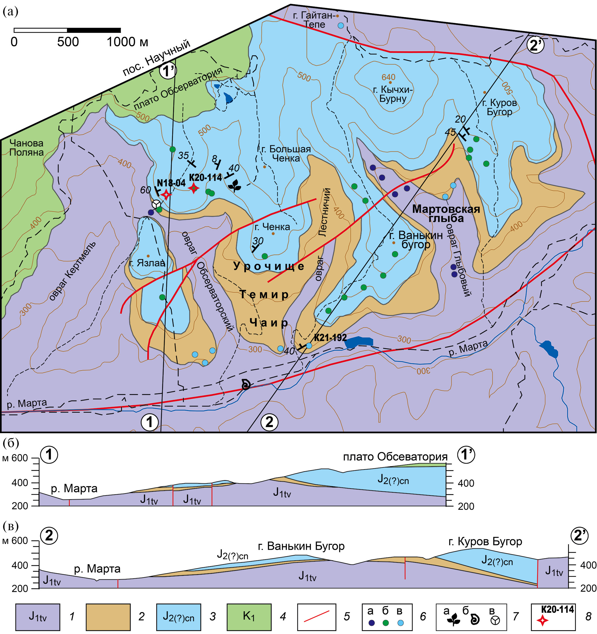 1 – верхнетаврическая свита таврической серии (флиш); 2 – темир-чаирская хаотическая толща, состоящая из черных тектонизированных алевроаргиллитов, в которых незакономерно размещены разноразмерные блоки и пластовые отторженцы верхнетаврической свиты, ченкской толщи и других пород, в том числе нижнепермских известняков (Мартовская глыба); 3 – ченкская толща (песчаники с прослоями аргиллитов); 4 – нижнемеловые песчанистые известняки и известковистые песчаники; 5 – разломы (на геологических разрезах показаны вертикальными, поскольку нет никаких объективных данных, чтобы оценить направления и углы их наклона); 6 – точки наблюдения, в которых задокументированы обнажения: (а) флиша верхнетаврической свиты, (б) песчаников ченкской толщи, (в) пород, участвующих в строении хаотической темир-чаирской толщи, расслаивающей верхнетаврический флиш и ченкские песчаники; 7 – места находок палеонтологических остатков: а – флоры (Королев, 1988), б – фауны (Кликушин, 1988), в – споро-пыльцевых остатков (Тевелев и др., 2012); 8 – места отбора проб (с указанием их номеров) для выделения и последующего U–Pb датирования зерен детритового циркона