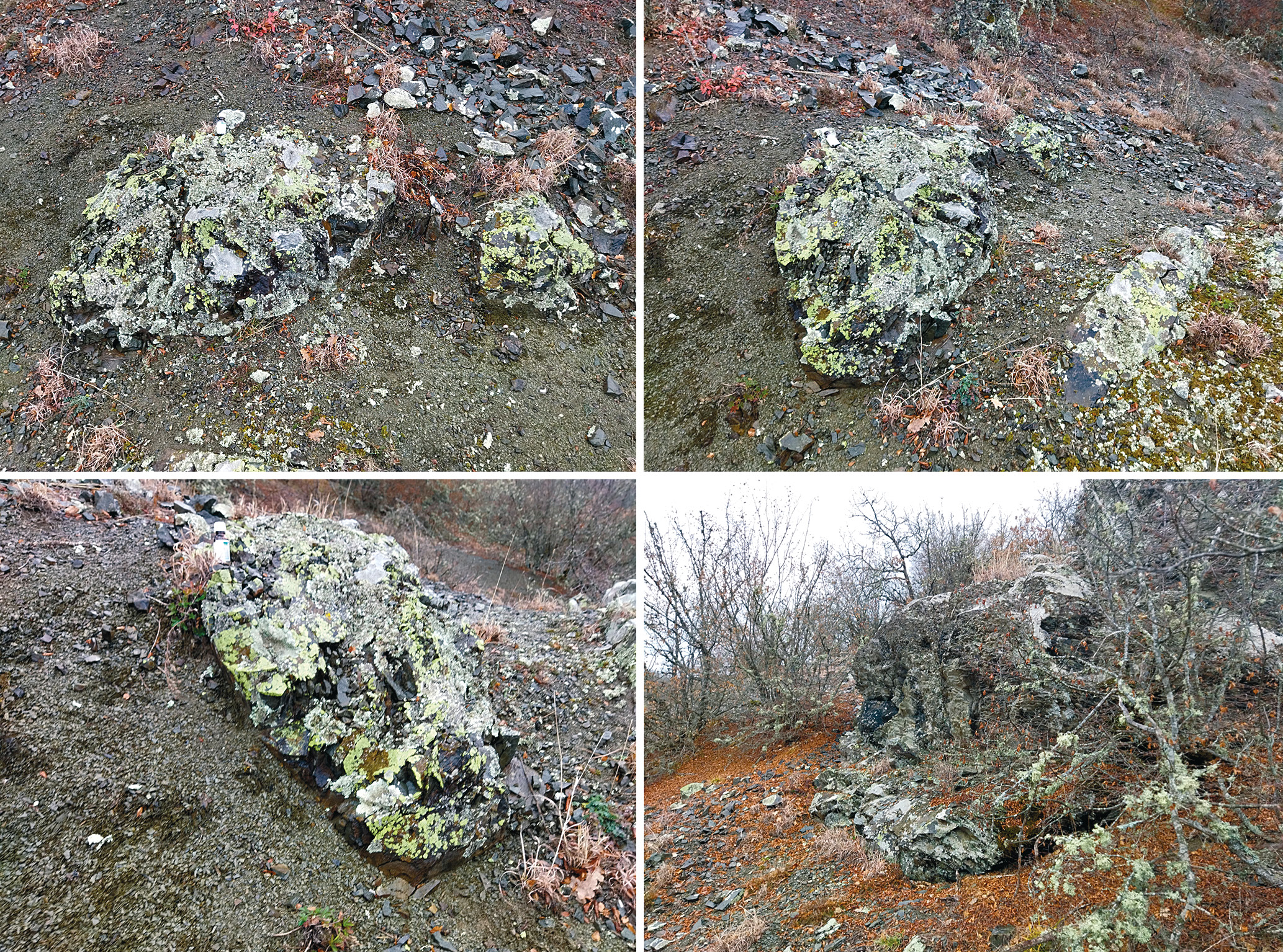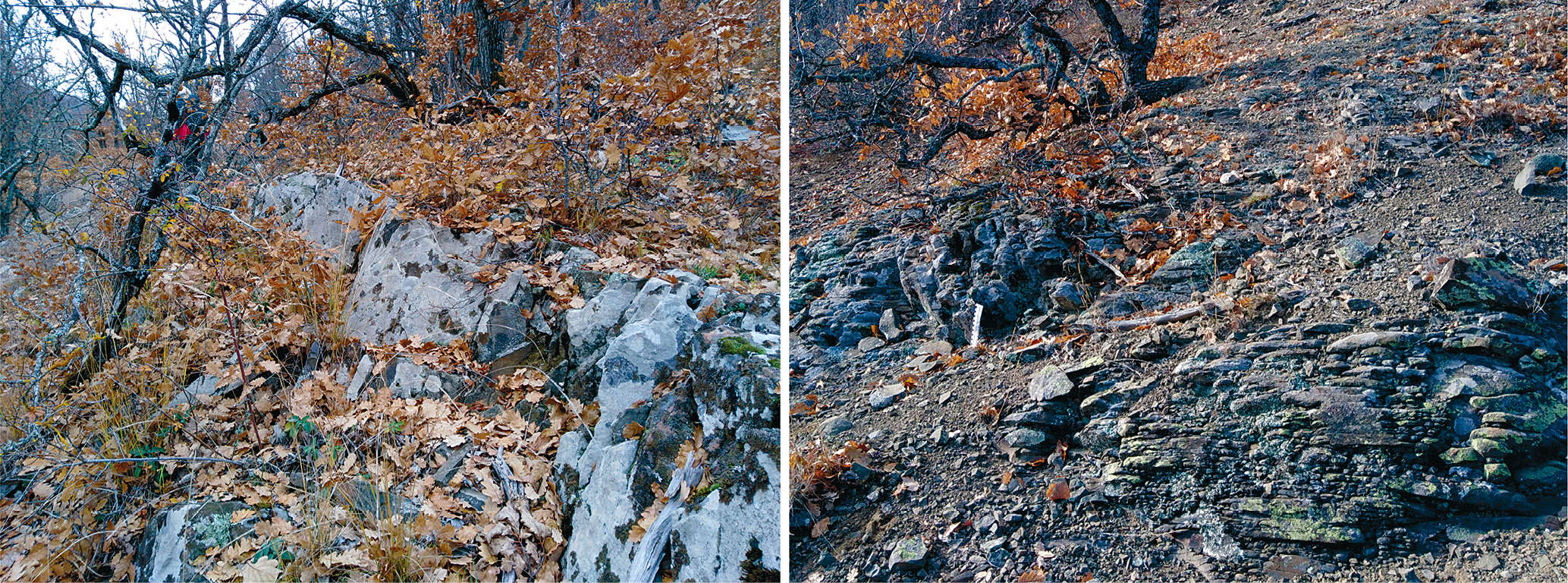 Рис. 4. Примеры фрагментарных обнажений ченкских песчаников массивного облика (слева – т.н. K20-111: 44°43'8.35” с.ш., 34° 2'39.64” в.д.) и песчаников с грубой косой слоистостью (справа, т.н. K20-114: 44°42'57.17” с.ш., 34° 0'42.35” в.д.)
