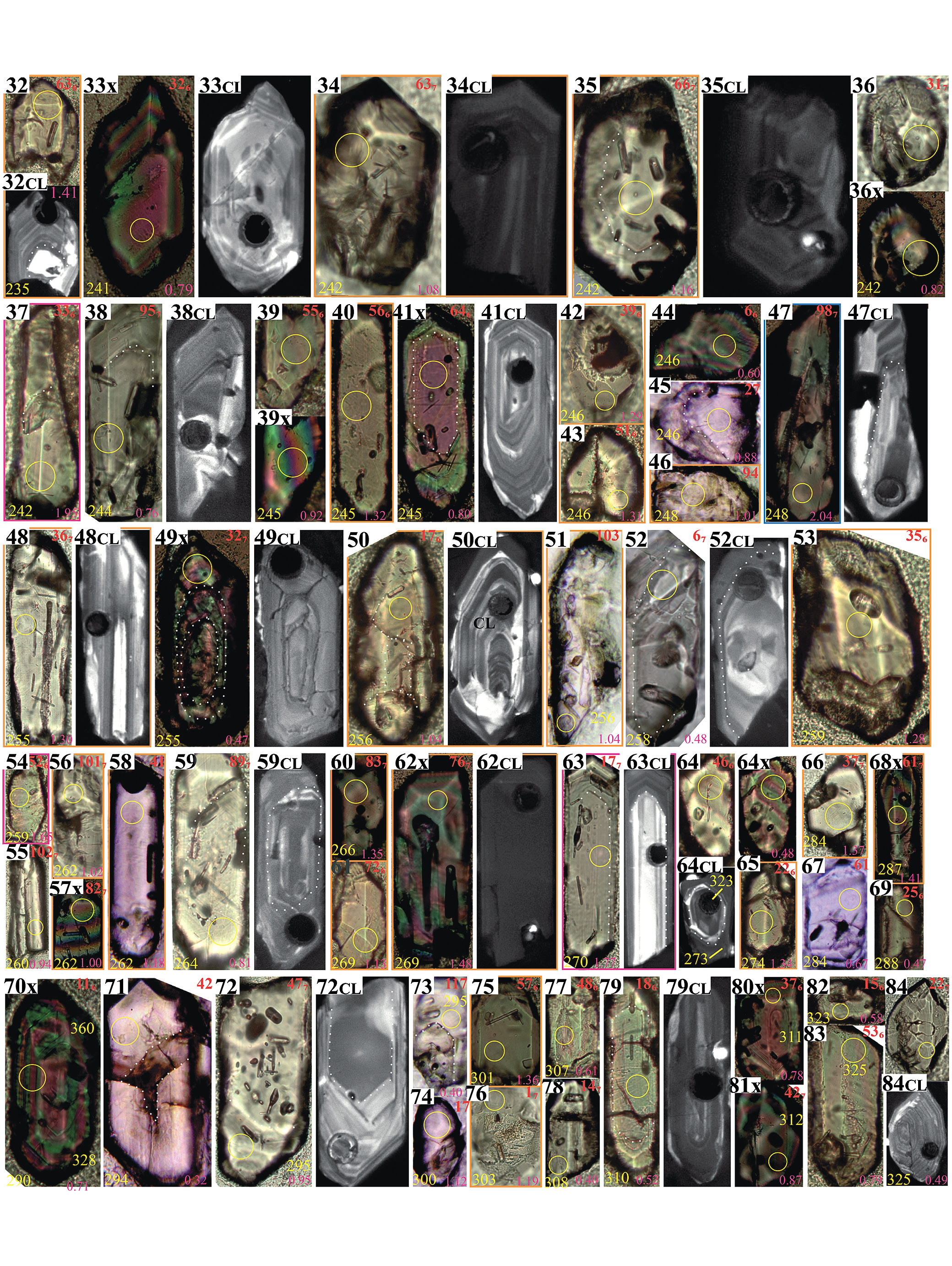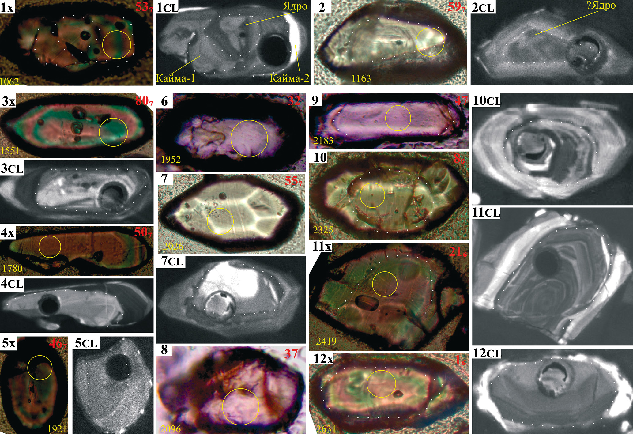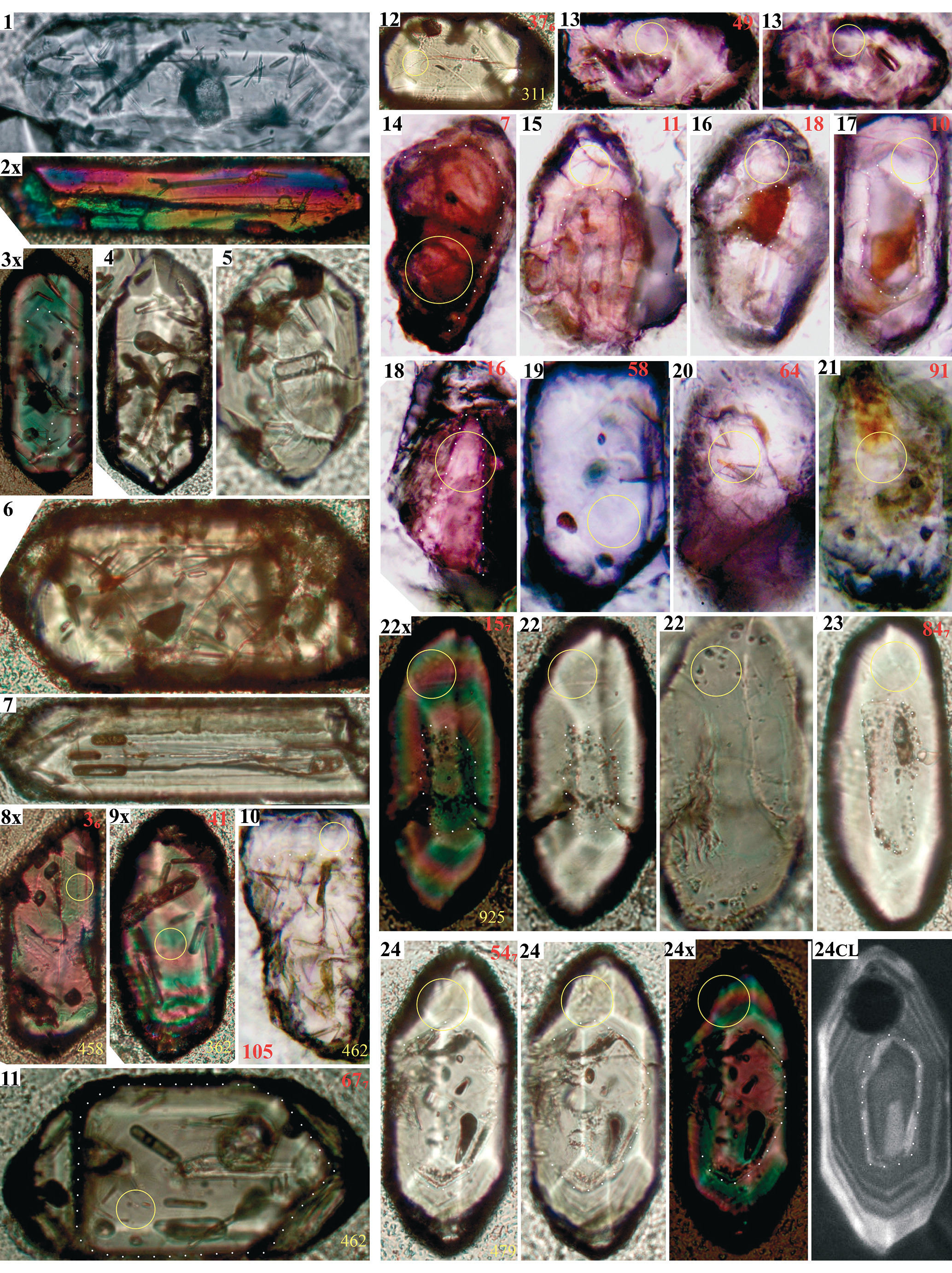 Для каждого изображения в левом верхнем углу черным цветом указан его номер, индекс “x” означает, что изображение получено при скрещенных николях; индекс “CL” – в катодных лучах. В правом верхнем углу красным цветом указан номер анализа: без индекса – из пробы N18-004, с индексом 6 или 7 (номер шашки) – из пробы К20-114. Для некоторых зерен показаны от двух до четырех изображений (либо в параллельных и скрещенных николях, либо с разной глубиной фокусировки, либо в катодных лучах). Если был произведен пробоотбор, то положение кратера лазерной абляции показано желтым кружком (диаметр 25 мкм). В случаях, когда для зерна была получена кондиционная датировка, рядом с изображением этого зерна приведен его возраст в млн лет. Белыми точечными линиями намечены видимые древние ядра зерен циркона или границы между разнородными частями