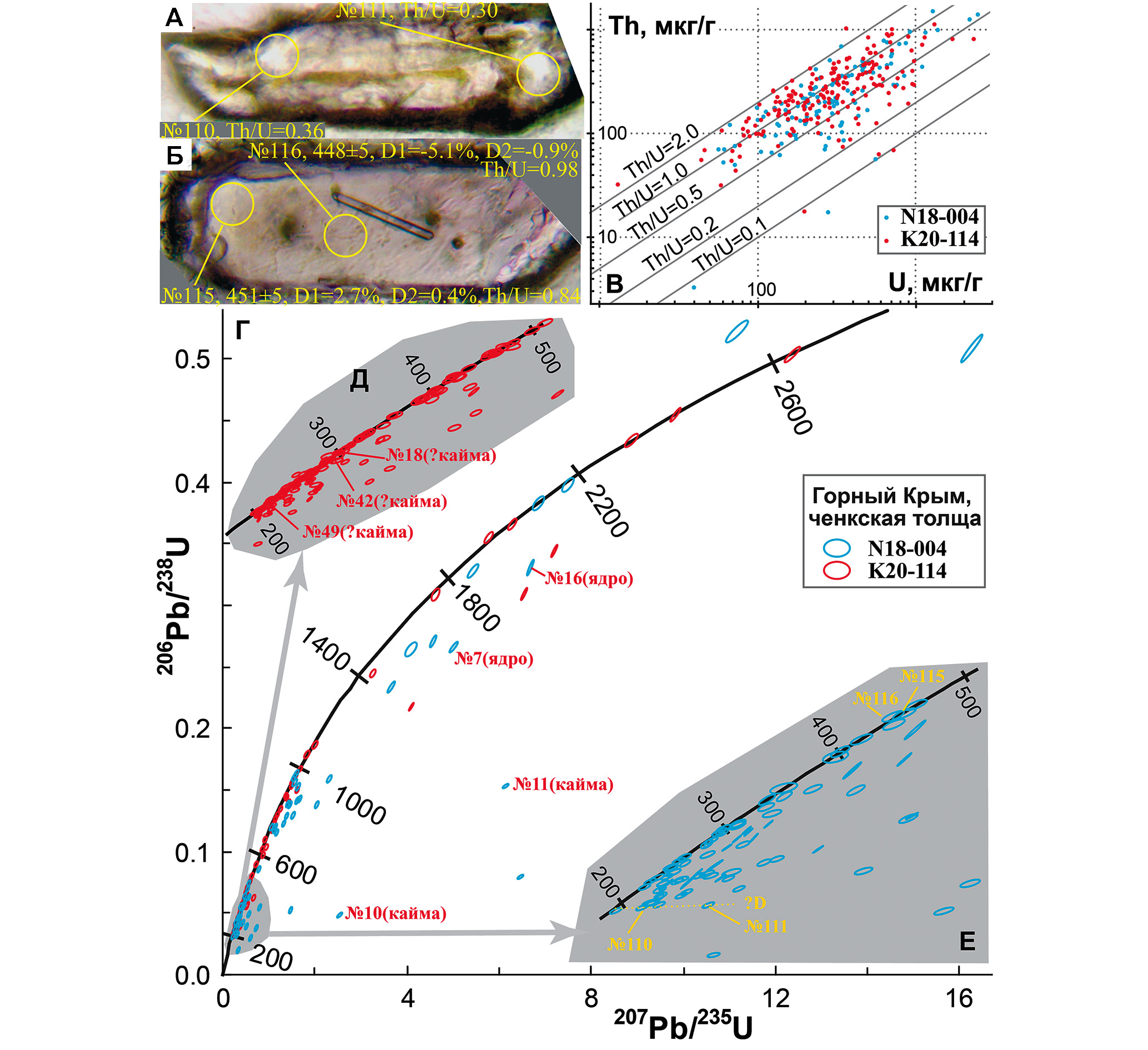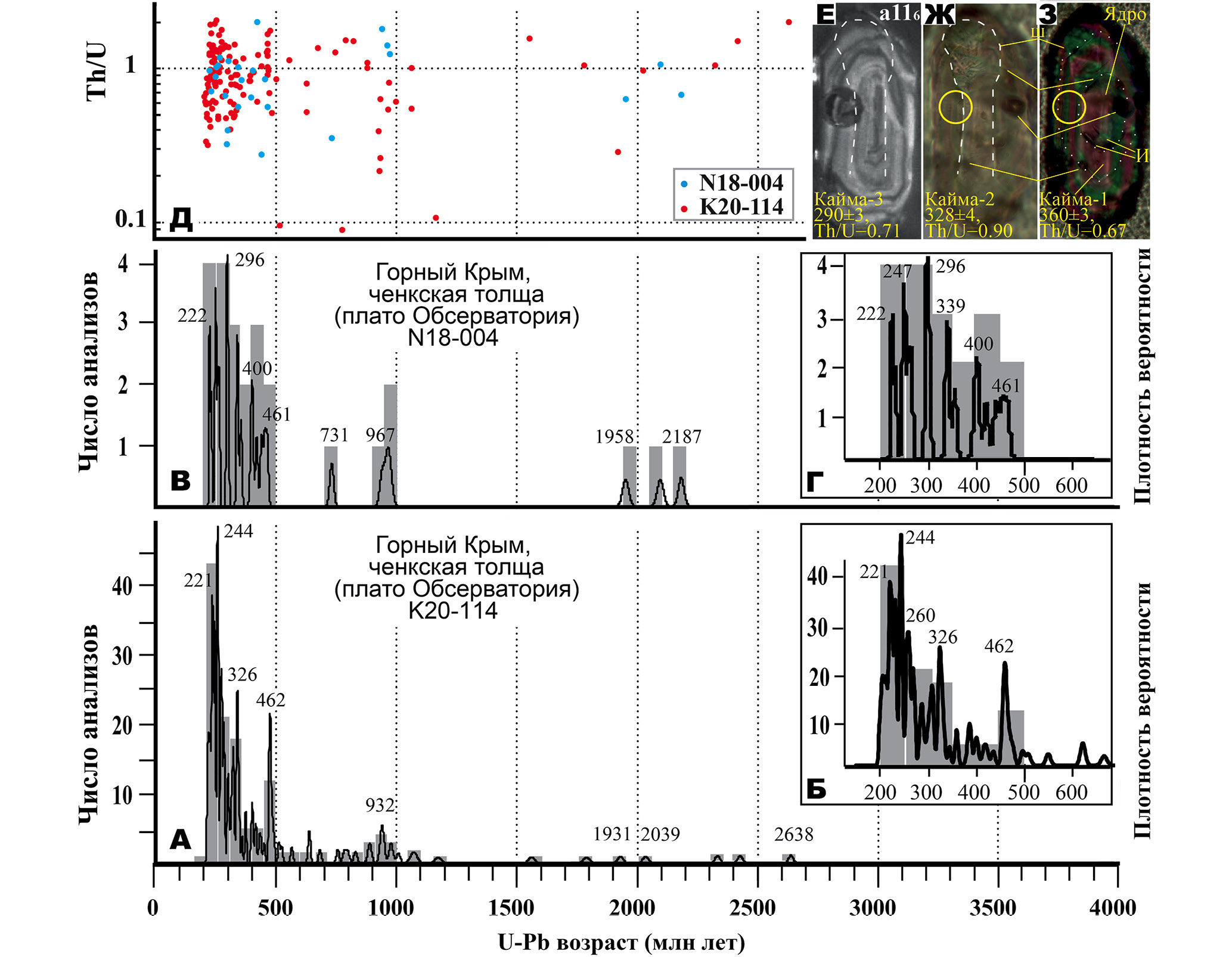 Рис. 10. Результаты изучения зерен детритового циркона из песчаников ченкской толщи, пробы N18‐004 и К20-114