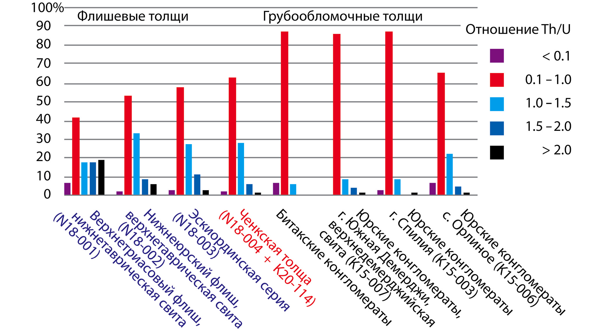 Многочисленные включения, ядра кристаллов и обрамляющие их каймы, а также разнообразные нарушения (трещины и метамиктные зоны) в dZr из песчаников ченкской толщи – это свидетельства сложной истории формирования и преобразования этих зерен. При этом метаморфических преобразований самих песчаников, из которых отобраны пробы К20-114 и N18-004, не зафиксировано. Это означает, что изученные dZr попали уже измененными в песчаный осадок, при литификации которого были образованы песчаники ченкской толщи.