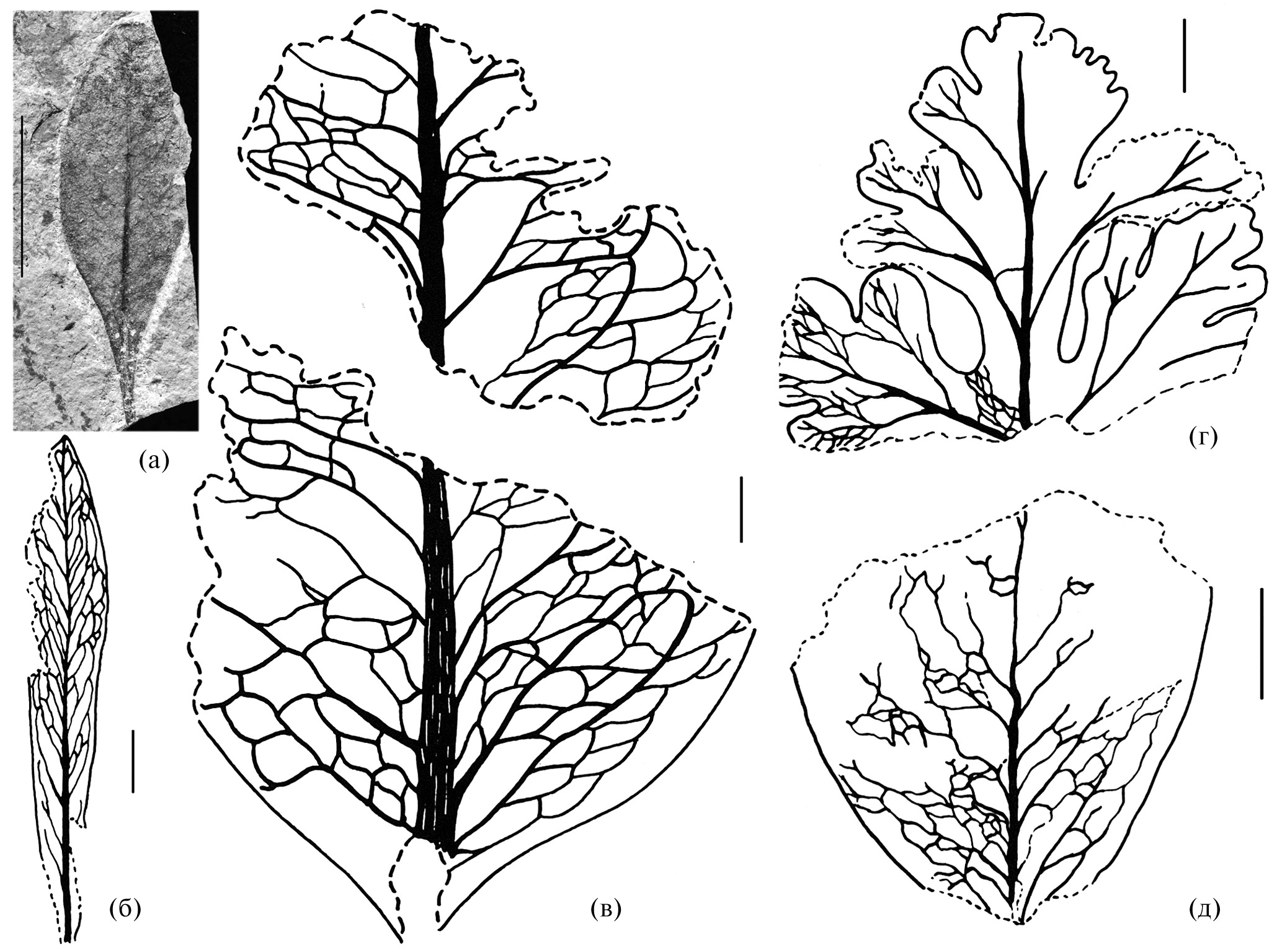 а – Dicotylophyllum pusillum Vachrameev (ГИН РАН 3353/17), зазинская свита Забайкалья, предположительно баррем–апт (Вахрамеев, Котова, 1977); б–д – ископаемые листья из зоны I (апт–нижний альб), серия Потомак, свиты Патуксент и Арундел Клей (Doyle, Hickey, 1976): б – Rogersia angustifolia Fontaine (USNM 192339), Вирджиния; в – Proteaephyllum ellipticum Fontaine (USNM 192347a, 192347b), Вирджиния; г – Vitiphyllum multifidum Fontaine (USNM 31824), Мэриленд; д – Celastrophyllum latifolium Fontaine (USNM 31814), Мэриленд