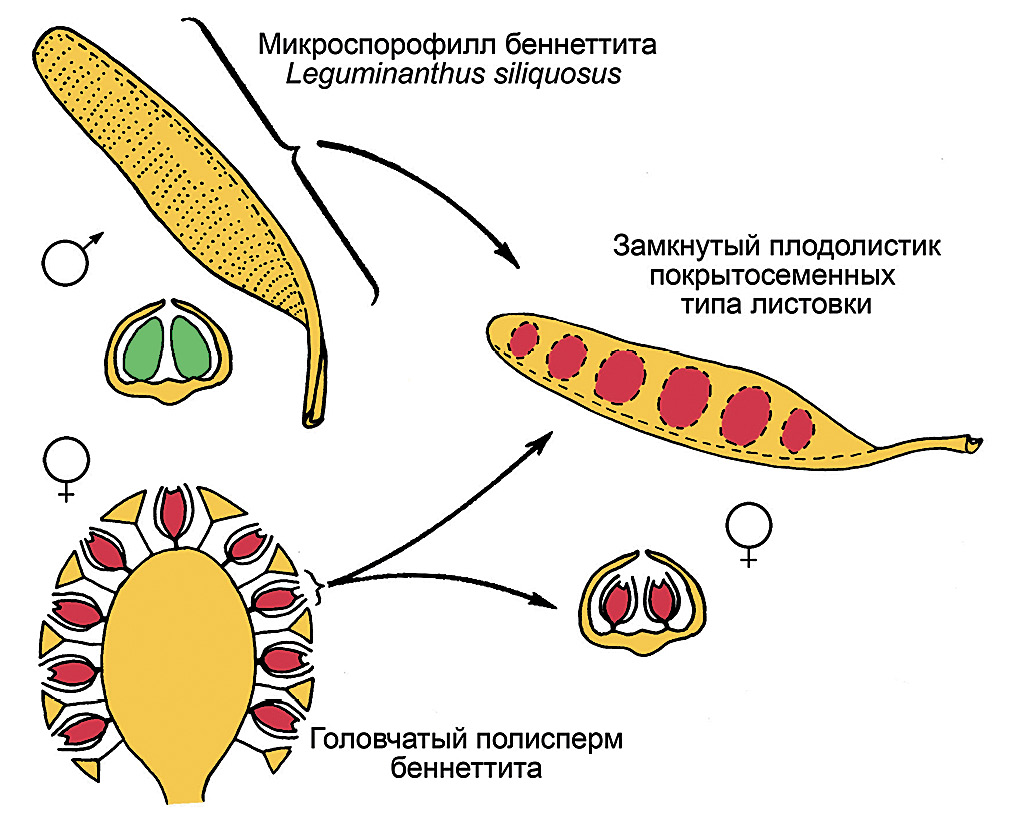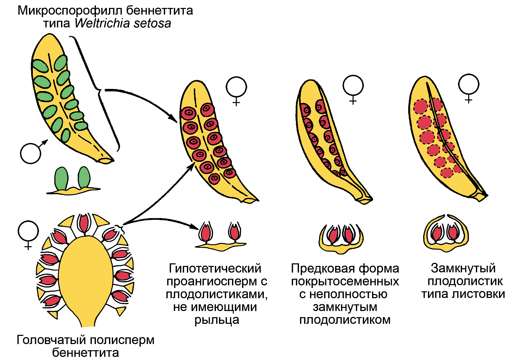У голосеменных семезачатки располагаются на мегаспорофилле (если последний имеется) абаксиально, а у плодолистика покрытосеменных – адаксиально. Столь значительное различие в строении женских фруктификаций этих растений практически исключало возможность происхождения вторых от первых. У беннеттитов мегаспорофиллов не было, а семезачатки вперемежку с кроющими чешуями располагались не на листовидном органе, а на оси головчатого полисперма. Однако это одна из немногих групп голосеменных растений с микроспорангиями, располагавшимися на адаксиальной стороне спорофиллов. Согласно концепции Мейена, “гинецей покрытосеменных мог возникнуть путем перестройки беннеттитовых женских фруктификаций по образцу мужских, причем семезачатки располагаются так же, как синангии” (Мейен, 1986, с. 291), что, видимо, могло происходить сальтационно путем изменения места экспрессии регуляторных генов. При этом именно порядок голосеменных растений Bennettitales оказывается морфологически наиболее подходящим для роли предка покрытосеменных.
