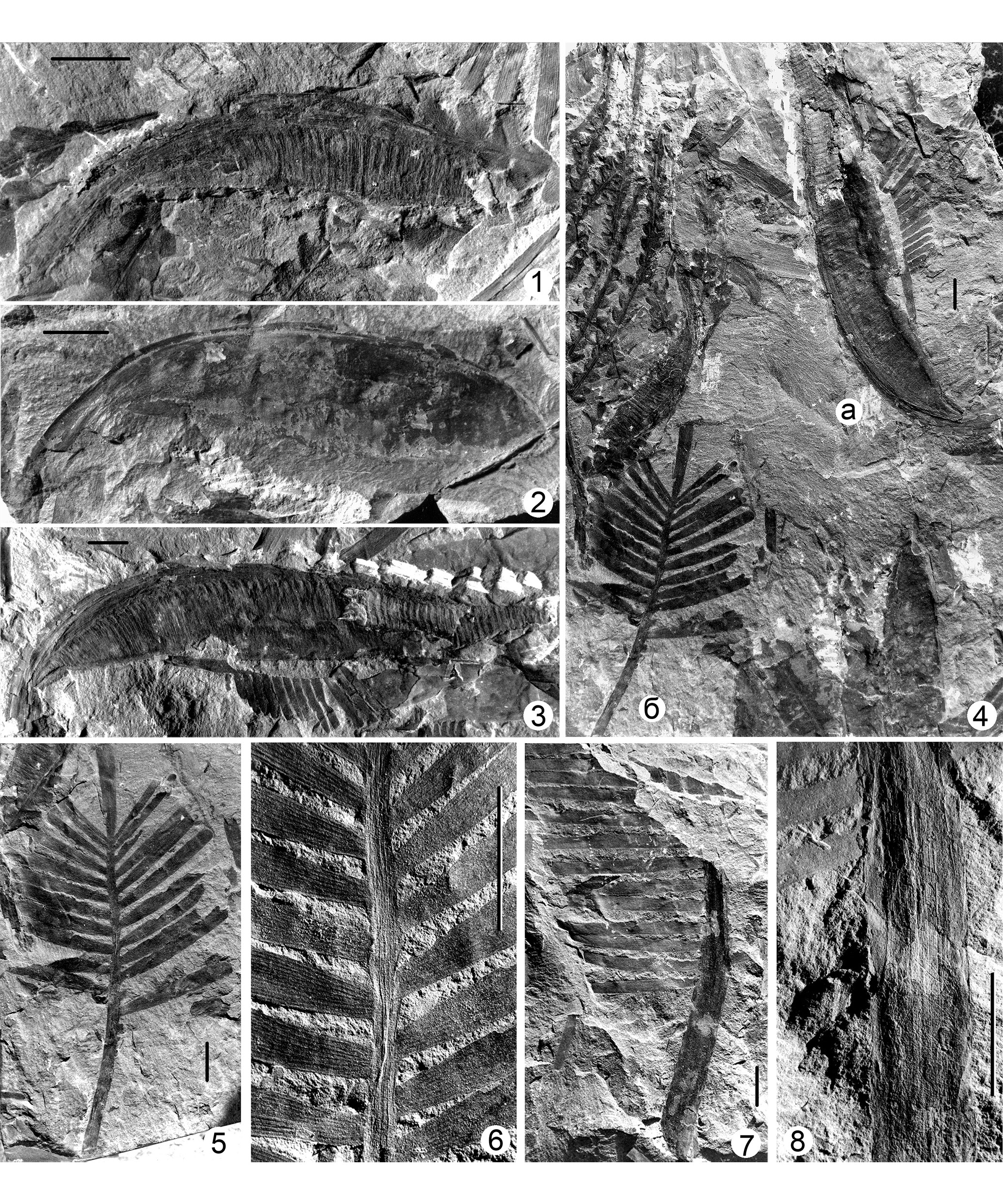 Таблица I. Фиг. 1–3 – микроспорофиллы Leguminanthus siliquosus (Leuthardt) Kräusel et Schaarschmidt; фиг. 4 – совместное нахождение микроспорофиллов и листьев: 4а – Leguminanthus siliquosus (Leuthardt) Kräusel et Schaarschmidt, 4б – лист Pterophyllum sp. (cf. P. jaegeri Brongniart); фиг. 5, 6 – Pterophyllum sp. (cf. P. jaegeri Brongniart): почти целый отпечаток листа (5) и увеличенная часть рахиса с отпечатками проводящих пучков (6); фиг. 7, 8 – Pterophyllum sp. (cf. P. jaegeri Brongniart): фрагмент отпечатка листа (7) и увеличенная часть широкого черешка с отпечатками проводящих пучков (8); коллекция № 1886l.16 Музея естественной истории в Вене; верхний триас Лунца, Австрия; длина масштабной линейки 1 см