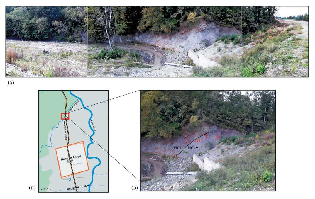 Отложения алкунской свиты вскрываются по одному из левых притоков р. Майрамадаг, в 3.5 км южнее одноименного поселка (рис. 1). Алкунская свита обнажена здесь не полностью, а только в своей самой верхней части, что обусловлено наличием в этом районе разрывных нарушений. Неполная мощность алкунской свиты в данном разрезе составляет 4.1 м (Белуженко и др., 2018).
