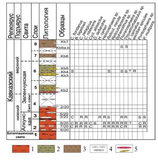 Аббревиатуры: S – единично (1–3 экз. на 300 полей зрения); R – редко (от 10 до 30 экз. на 300 полей зрения); C – часто (от 5 экз. в каждом поле зрения); A – обильно (более 10 экз. в каждом поле зрения). Септ. слои – септариевые слои. Условные обозначения: 1 – глины бескарбонатные; 2 – глины карбонатные; 3 – глины бескарбонатные, тонкослоистые, с рыбными остатками; 4 – известковистые септариевые и сидеритовые конкреции; 5 – известковые и песчаные прослои.